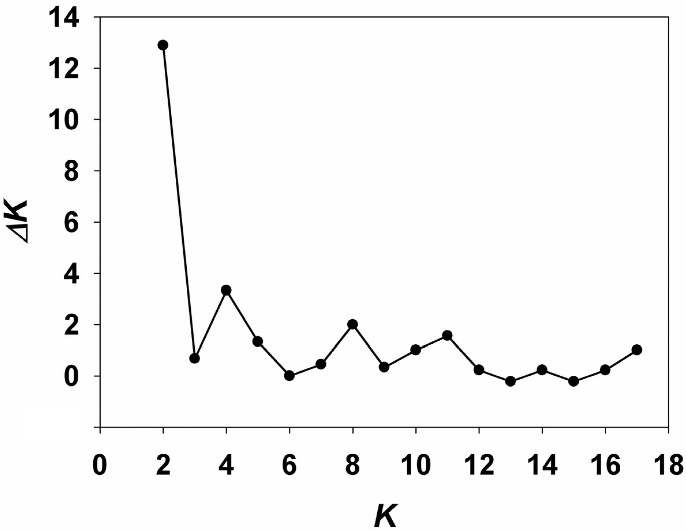 The traditional population differentiation approach was based on Fst values. The Weir and Cockerham’s estimator of the fixation index Fst [40] was calculated using GENEPOP v.3.4 [41]. The correlation between genetic differentiation and geographic distance was examined by Mantel test using IBDWS v.3.15 [43].The distribution of genetic variation was investigated by performing an analysis of molecular variance (AMOVA) using ARLEQUIN v.3.5 [44], and by calculating allelic diversity, heterozygosity, and pairwise values of Fst among 17 populations. The genetic clustering of samples was examined using STRUCTURE v.2.3.2 and BAPS v.4.14 [27,28,29]. Population structure analyzed using STRUCTURE v.2.3.2 employed the Bayesian clustering approach with a burn-in period of 50,000 iterations and one million Markov chain Monte Carlo (MCMC) repetitions under the admixture ancestry model. 20 independent runs were performed for each testing K value, ranging from K = 1 to 17, and ΔK was used to calculate the optimal number of genetic clusters (K) [45]. When estimating individual ancestry coefficients using BAPS v.4.14 [28,29], we used the recommended values that 100 iterations to estimate the admixture coefficients individual, 20 iterations to estimate the admixture coefficients for the reference individuals and 200 reference individuals from each population.