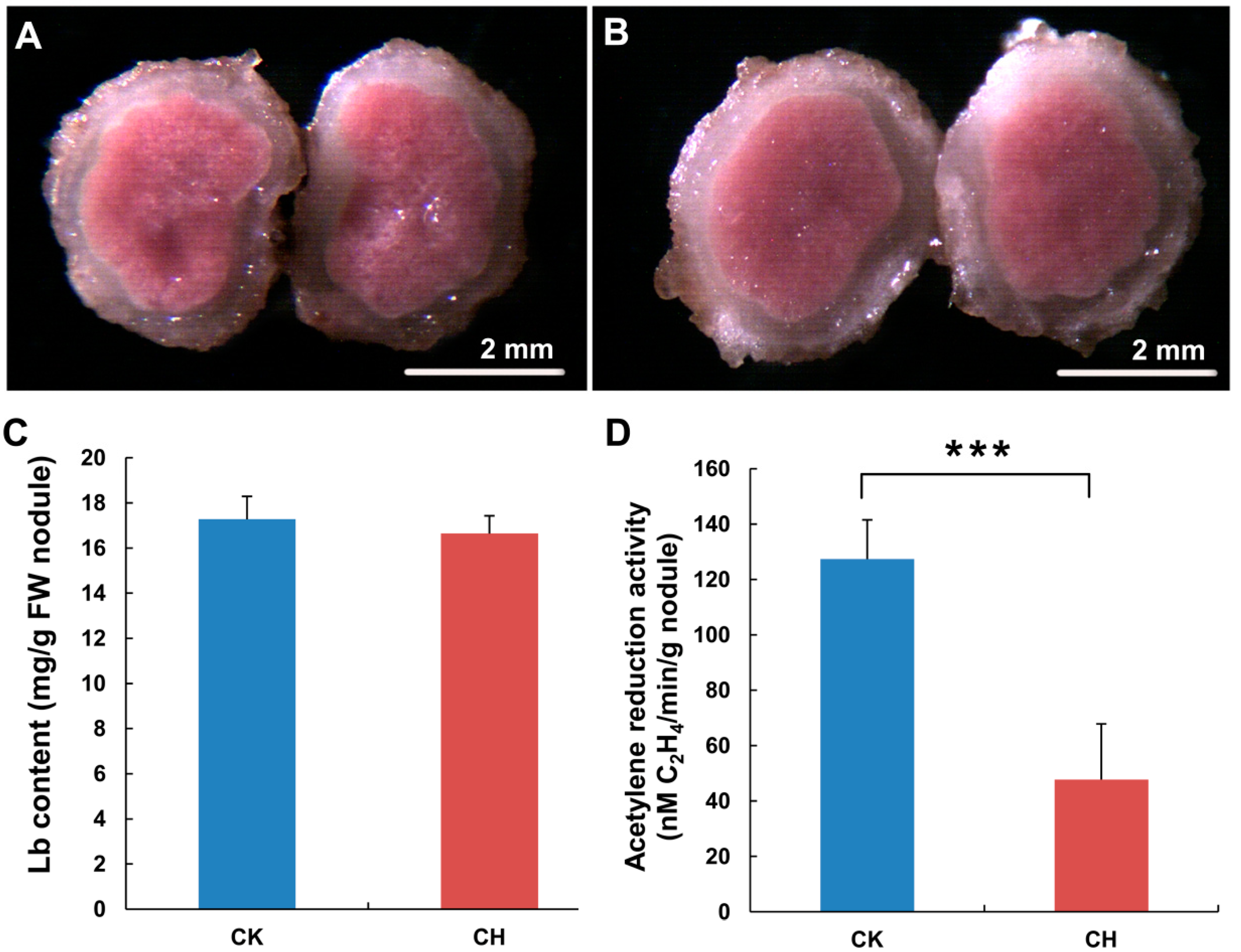The nitrogen use efficiency of nitrogen-fixing nodules in soybean was affected by low temperature treatment. Seeds of Williams 82 were sown into a mixture of vermiculite and perlite and irrigated with a low nitrogen solution. Twenty-eight days after inoculation with Bradyrhizobium japonicum, the plants were dipped and washed with phosphate-buffered saline and then transferred to a low nitrogen solution without (CK) or with cold treatment (CH) at 4 °C for 24 h. The nodules were then collected and used for a phenotypic analysis and measurements of the leghemoglobin (Lb) content and acetylene reduction activity (ARA). Cross-sections of untreated and cold-treated nodules are shown in (A,B), respectively. Bars: 2 mm; The measured Lb contents and ARA levels are shown in (C,D), respectively. Student’s t-tests were performed; statistically significant results are marked with *** (p < 0.001).