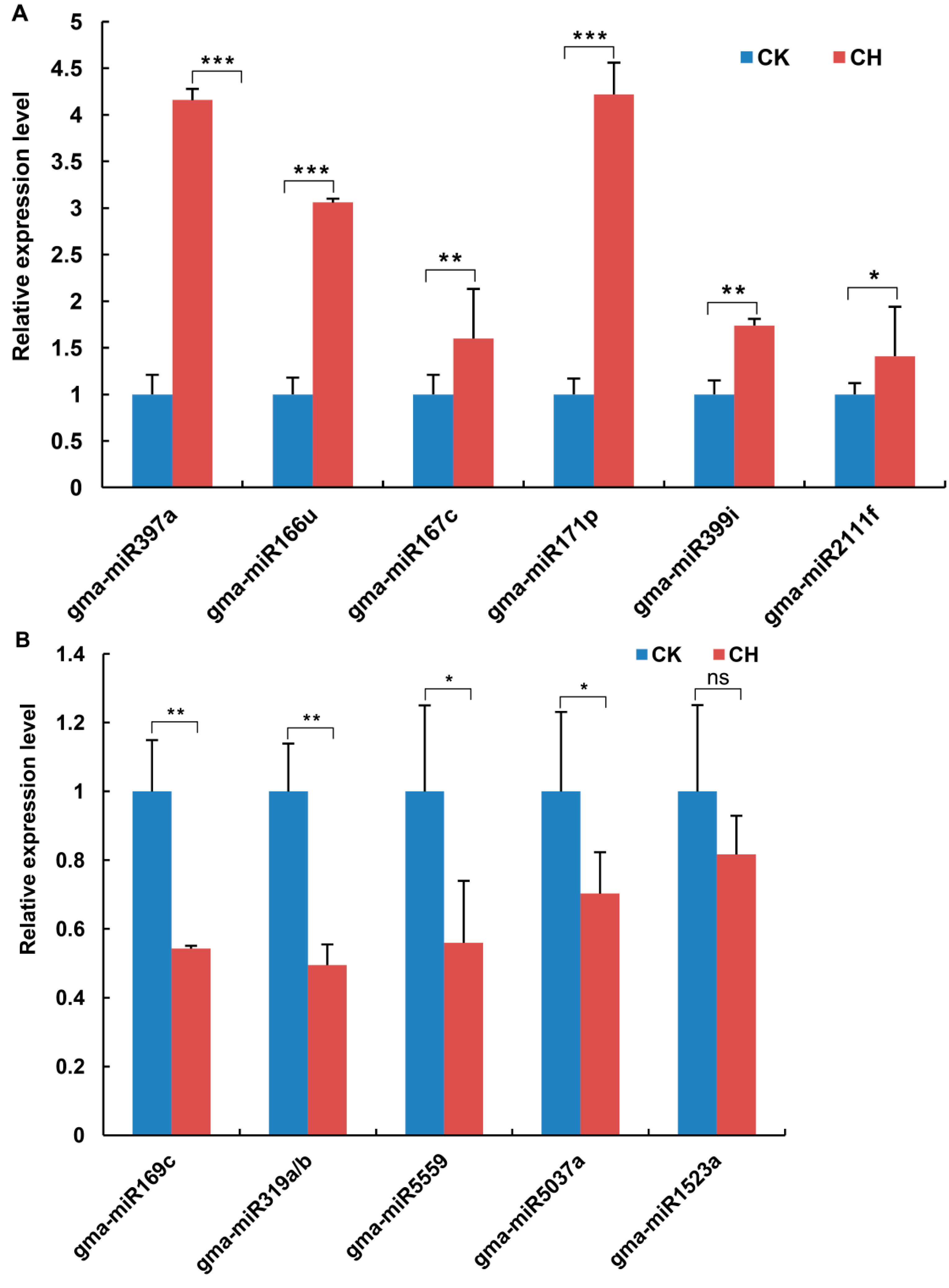 Quantitative reverse transcription PCR (RT-qPCR) analysis of miRNA expression in low temperature-treated mature nodules. Small RNAs were isolated from functional soybean nodules 28 days after inoculation with B. japonicum strain USDA110 in the cold (4 °C for 24 h); untreated nodules were used as a control. (A) The miRNAs that were up-regulated by low-temperature treatment are shown; (B) The miRNAs that were down-regulated by low-temperature treatment are shown. 5.8S rRNA was used as an internal control. The results shown are the averages ± SE of three biological replicates. Error bars indicate the standard deviation. Student’s t-tests were performed; statistically significant results are marked with * (p < 0.05); ** (p < 0.01); *** (p < 0.001); ns: not significant (p > 0.05).