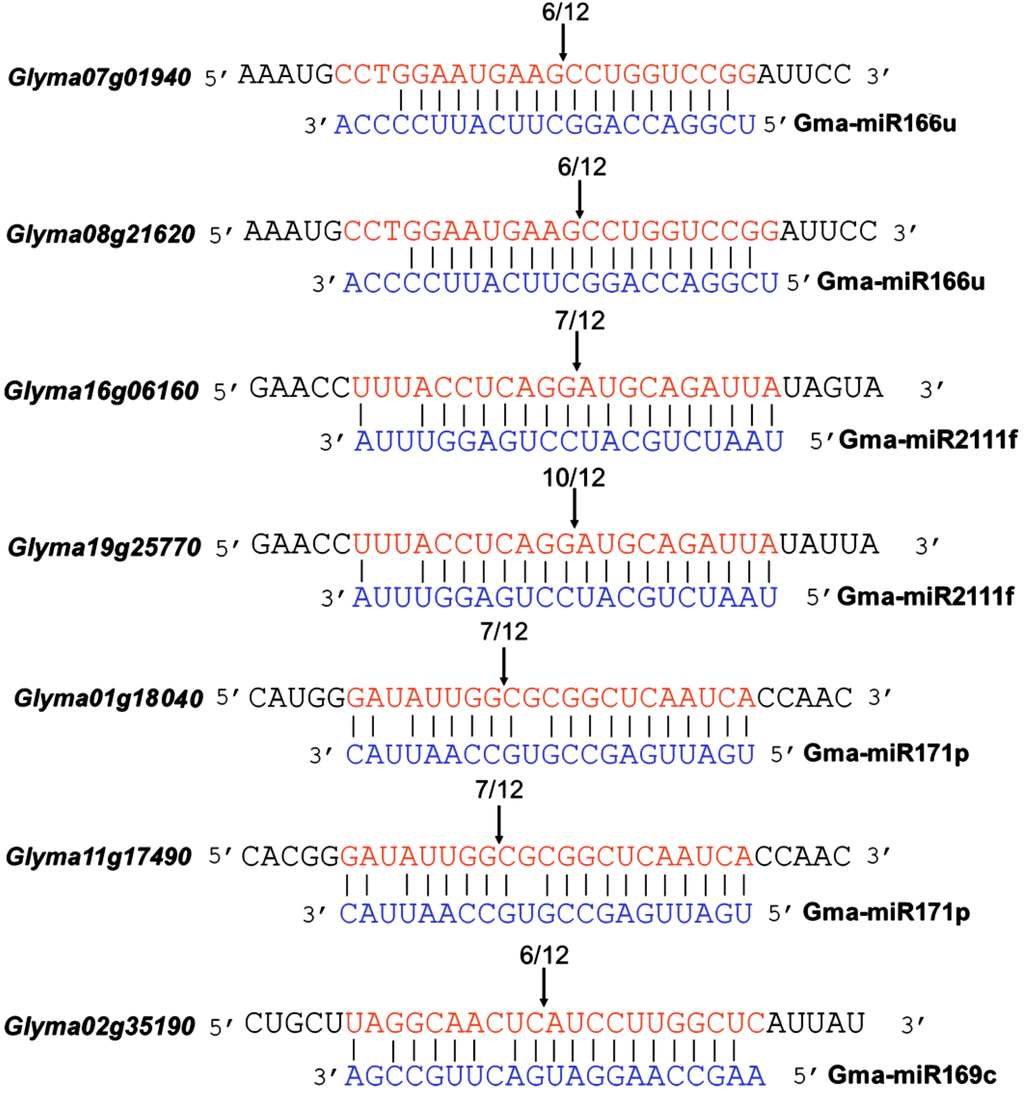 Validation of the miRNA-directed cleavage of the putative target genes using rapid amplification of 5' complementary DNA ends (5'-RACE). The predicted targets of gma-miR171p, gma-miR166u, gma-miR2111f and gma-miR169c were experimentally validated. The mRNA cleavage sites were determined by modified 5' RNA ligase-mediated (5'-RLM)-RACE. The mRNA sequence of each complementary site and its 5' and 3' flanking sequences (5 nucleotides (nt) from 5' to 3') and cloned miRNA sequence (from 3' to 5') are shown. Vertical arrows indicate the 5' termini of the miRNA-guided cleavage products, as identified by 5'-RACE, with the frequency of clones shown.