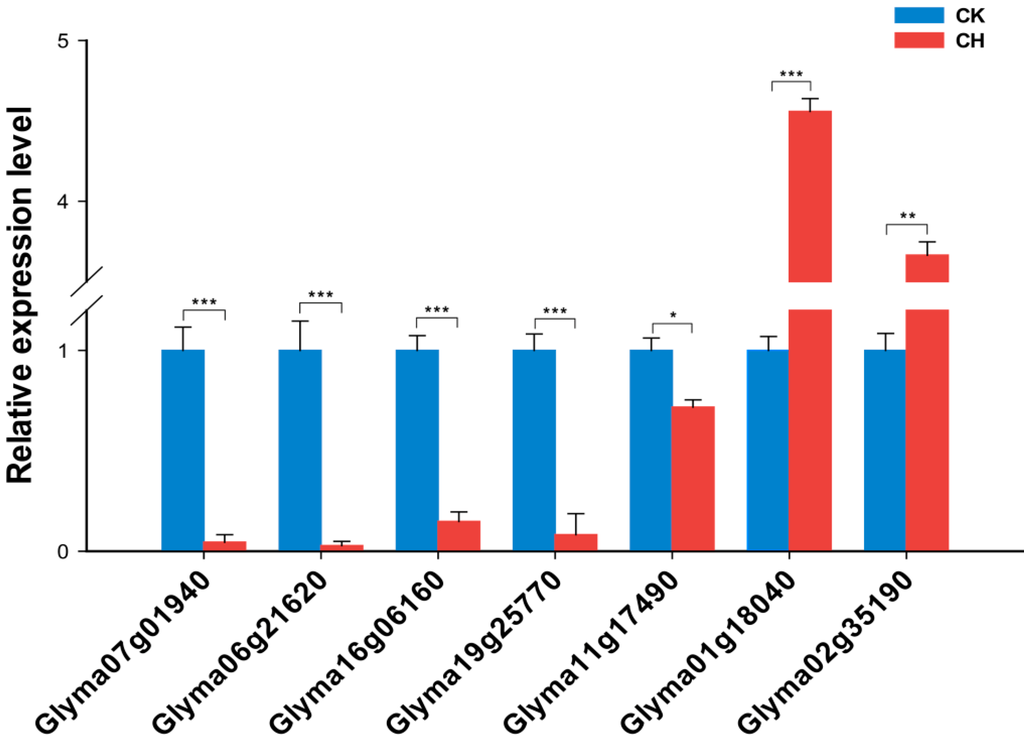 For small RNA library construction and high-throughput sequencing, plants with mature nodules at 28 dpi were exposed to 4 °C for 24 h. Small RNAs were isolated from the treated (CH) and untreated nodules (CK) with a mirVana™-miRNA Isolation Kit (Ambion, Austin, TX, USA), followed by sequencing using an Illumina-Solexa 1 Genetic Analyzer at the Beijing Genomics Institute (Beijing, China). The read counts for miRNAs in the two libraries were normalized to one million (normalized expression = actual miRNA count/total count of clean reads × normalized one order of magnitude).