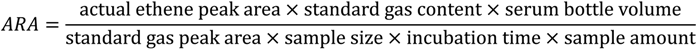 After treatment, mature nodules (28 days post-inoculation (dpi)) were collected from the treated plants, and the ARA level was analyzed by gas chromatography, as described previously [36]. The mature nodules were collected in a 25-mL serum bottle sealed with an isobutyl rubber stopper. A syringe was used to replace 10% of the air in the bottle with the equivalent amount of C2H2, and the bottle was placed in the dark at 28 °C for 2 h. An Agilent gas chromatograph system (Agilent 7890 A, Agilent Technologies, Wilmington, DE, USA) was used to measure the ratio of C2H2 to ethane in the bottle (the parameters were as follows: KB Alumina capillary column, 30 m; column temperature, 80 °C; detector temperature, 200 °C; carrier gas, N2, air and H2; and purity of the standard gas (C2H2), >99.9%). The ARA of nitrogenase was calculated using the following formula [72]: