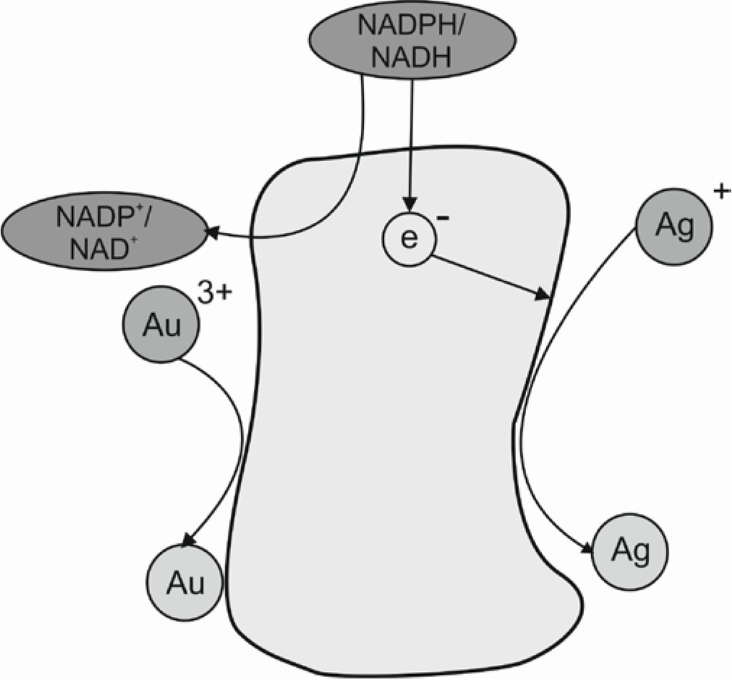 One of the enzymes involved in the biosynthesis of metal nanoparticles is the nitrate reductase which reduces the metal ions (Me+1) to the metallic form (Me0). This enzyme is a NADH− and NADPH-dependent enzyme. He et al. [] described the hypothetical mechanism for gold nanoparticles biosynthesis carried out by Rhodopseudomonas capsulate. These bacteria are known to secrete cofactor NADH- and NADH-dependent enzymes that can be responsible for the biological reduction of Au3+ to Au0 and the subsequent formation of gold nanoparticles. This reduction is initiated by electron transfer from the NADH by NADH-dependent reductase as electron carrier during which the gold ions gain electrons and are therefore reduced to Au0. A similar mechanism was also described by Sadowski [] for silver nanoparticles synthesis by Bacillus licheniformis. The likely mechanism for the biosynthesis of silver and gold nanoparticles is presented in Figure 2.