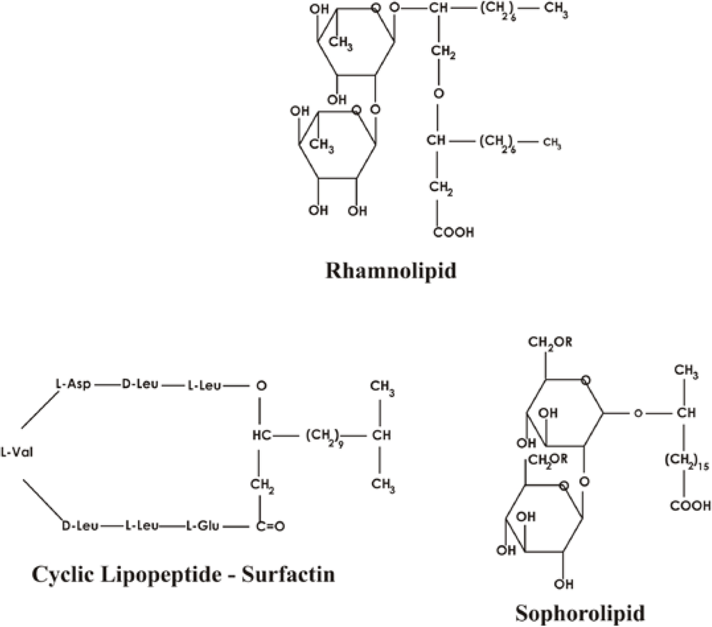 The functional properties of biosurfactants are mainly determined by their structures, such as the location and size of their functional groups. Rosenberg and Ron [] classified biosurfactants into two groups: (1) low-molecular-weight surface active agents (LMW) called biosurfactants, which efficiently lower surface and interfacial tension; and (2) high molecular-weight polymers (HMW) mainly referred to as bioemulsifiers which are more effective as emulsion-stabilizing agents. The first group includes: glycolipides, lipopeptides and phospholipids, whereas the second group includes polymeric and particulate biosurfactants such as emulsan and alasan [,]. Most such biosurfactants derived from the various microbial sources are either anionic or neutral. Their hydrophobic moiety is composed of long-chain fatty acids or fatty acid derivatives, whereas the hydrophilic portion can be a carbohydrate, amino acid, phosphate or cyclic peptide []. Their chemical nature and the concentrations produced depend on the type of microorganism and the growth conditions. Many microorganisms producing biosurfactants have been isolated from contaminated soils, effluents and waste water sources [].