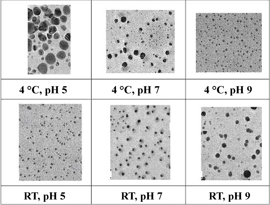 TEM (transmission electron microscopy) micrographs of silver nanoparticles synthetized at 4°C and room temperature (RT) at pH values 5, 7 and 9; modified from [] with permission from Elsevier, copyright 2009.