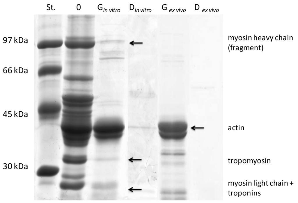 Electrophoretic separation (SDS-PAGE) of the hydrolysates of salmon myofibrillar proteins after ex vivo digestion (ex vivo) or in vitro hydrolysis (in vitro). Standard (St.)-mass marker (97–30 kDa), G-samples after the 2 h “gastric”/pepsin phase, D-samples after 1 h “duodenal”/pepsin + Corolase PP phase, “0”-samples after the “chewing” phase (see the “Methods” section).