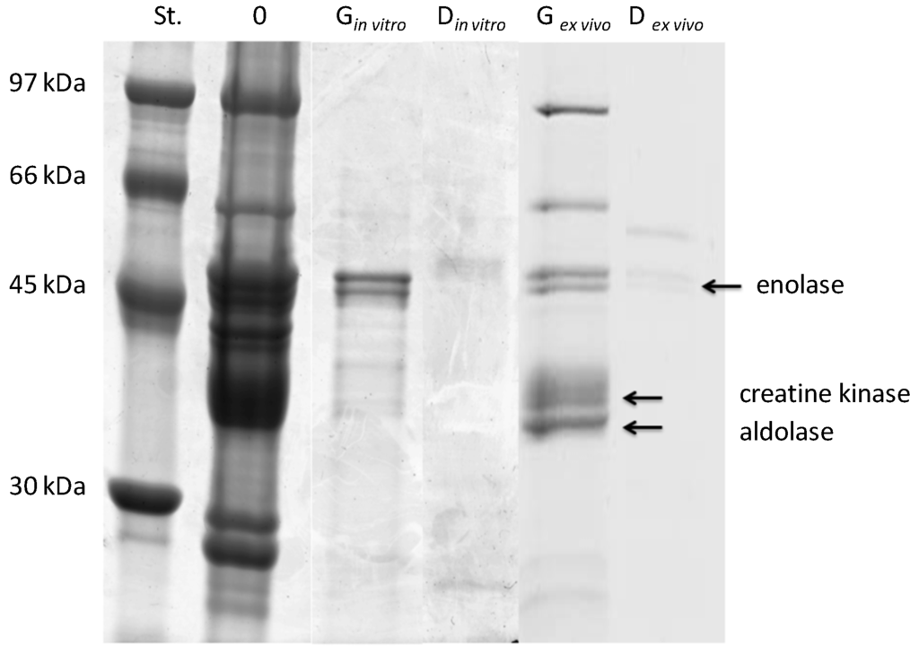 Electrophoretic separation (SDS-PAGE) of the hydrolysates of salmon sarcoplasmic proteins after ex vivo digestion (ex vivo) or in vitro hydrolysis (in vitro). Standard (St.)-mass marker (97–30 kDa), G-samples after the 2 h “gastric”/pepsin phase, D-samples after 1 h “duodenal”/pepsin + Corolase PP phase, “0”-samples after the “chewing” phase (see the Methods Section).
