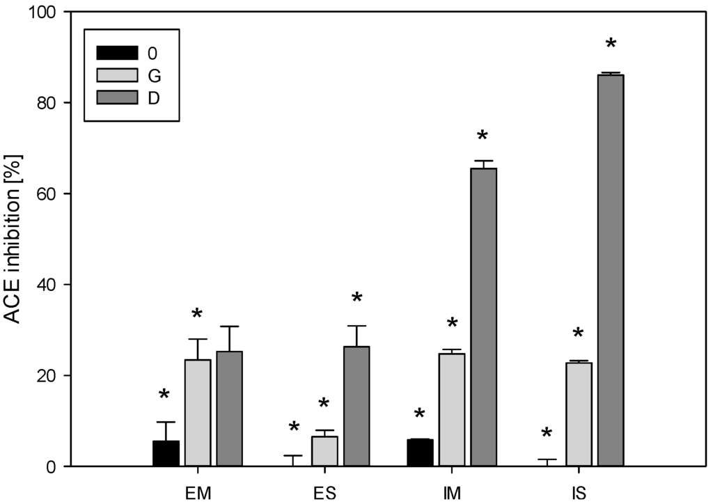 Angiotensin I-converting enzyme (ACE) inhibitory activities (expressed as % ACE-inhibitory activity of digested (E) and hydrolysed (I) myofibrillar (M) and sarcoplasmic (S) proteins from salmon. 0-a sample after the “chewing” stage, G-a sample after the 2 h “gastric” stage, D-samples after the 1 h “duodenal” stage. Value means ± SD. of three determinations. The pillars denoted with “*” differ statistically at p < 0.05.