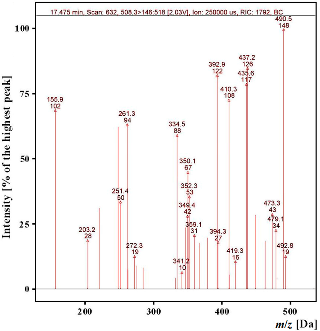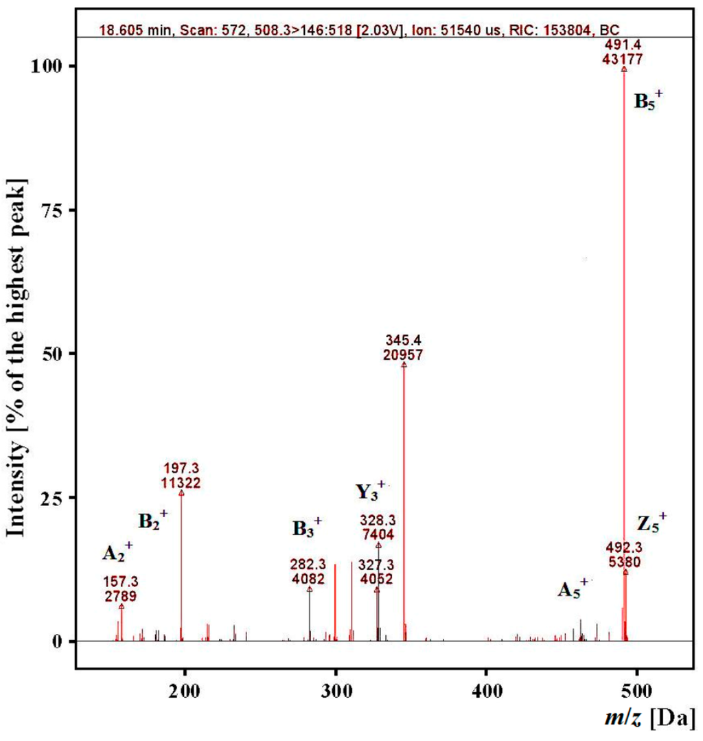 Mass spectra of fragment ions derived from the precursor ion with m/z = 508.3 from the “gastric-duodenal” hydrolysate produced with ex vivo digestion of myofibrillar salmon proteins (tR app. 18 min) obtained during identification of ALPHA-sequence peptide.