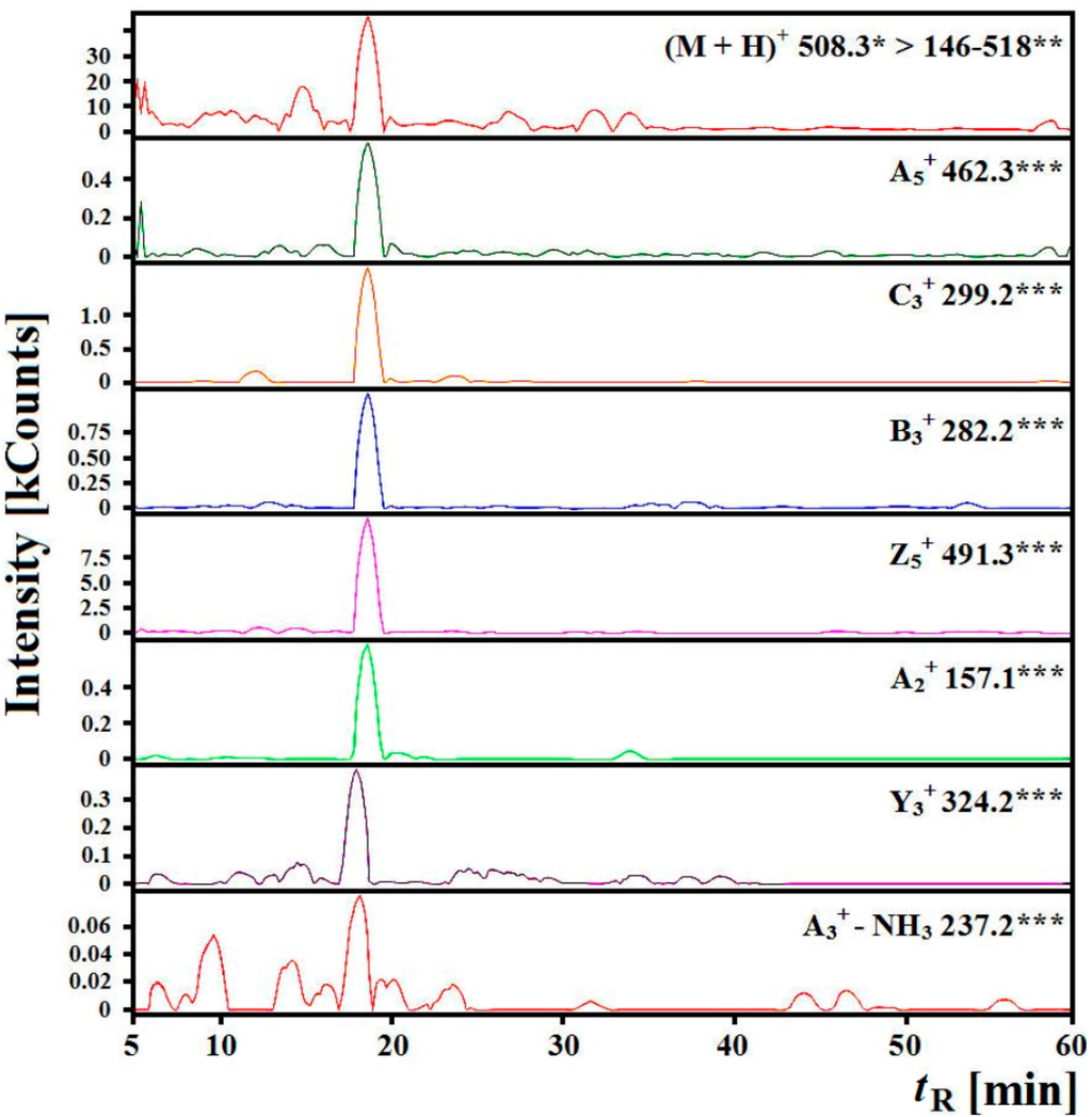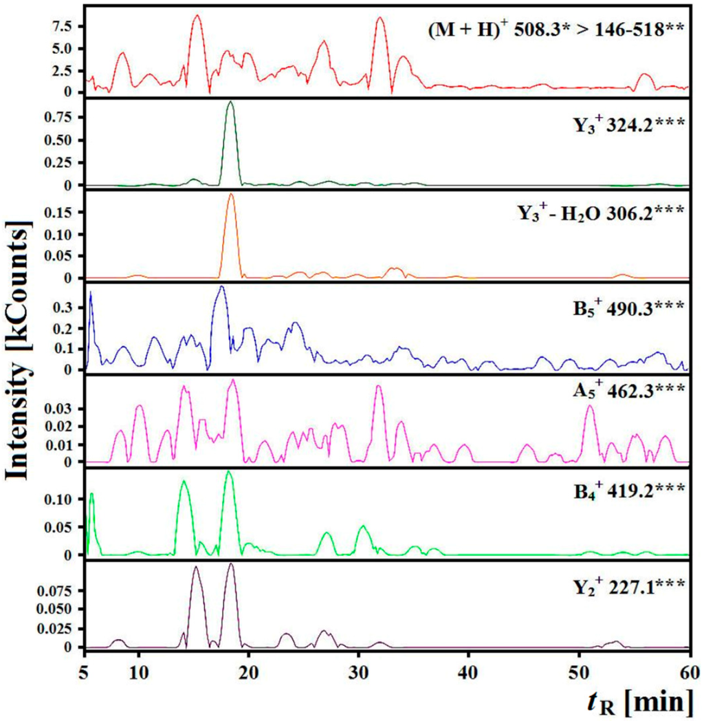Chromatograms of fragment ions derived from the precursor ions with m/z = 508.3 from the “gastric-duodenal” hydrolysate generated with ex vivo digestion of myofibrillar salmon proteins obtained during identification of ALPHA sequence peptide, where * m/z for the precursor ion, ** range of m/z for investigated fragment ions, *** a type of ion and m/z of the fragment ion, kCounts—count × 103, tR predicted = 17.57 min, tR experimental = 18.59 min.