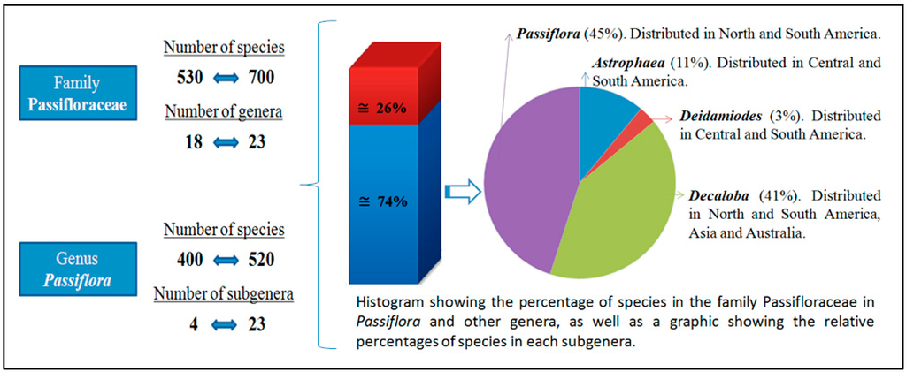The family Passifloraceae Juss. ex DC. belongs to the order Violales, class Magnoliopsida, and phylum Magnoliophyta. Although records of plants that belong to this family have been in existence since 1553, there have been disagreements regarding the number of genera and species in the family since the first literary record of a plant in this group was written in Colombia []. Over the past few centuries, several scientific studies have been published describing the species and the organization of the species into genera and subgenera. Estimates of the number of species in the Passifloraceae family vary between 700 [] and 520 [,,]. Such variations are the result of taxonomical uncertainties, the use of synonyms, and descriptions of new species. There is also no consistency in the number of genera, which varies between 18 [,] and 23 [].
