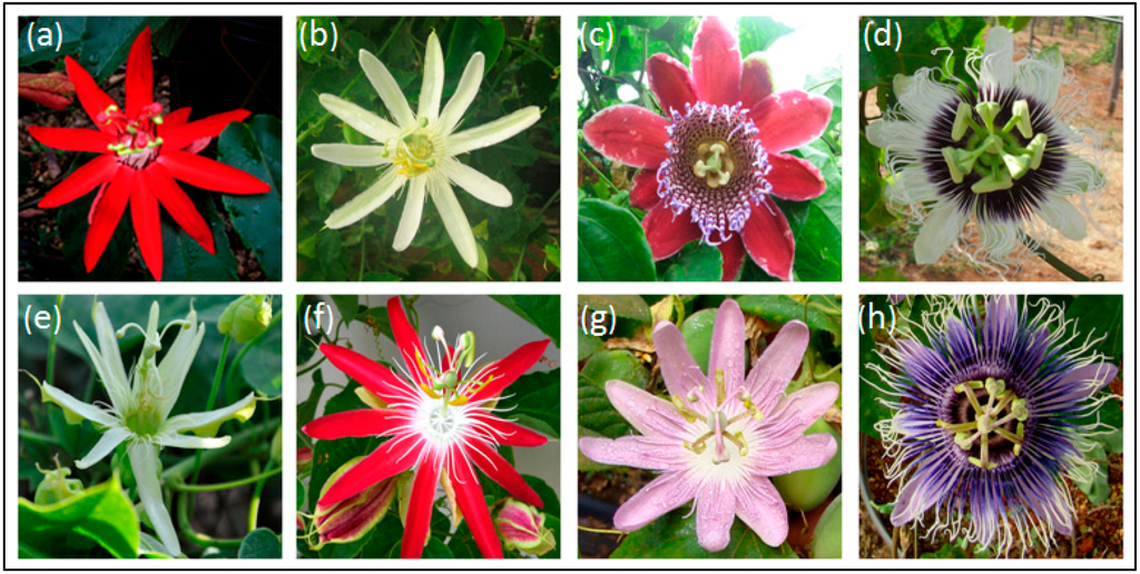 - Peixoto, M. Problemas e perspectivas do maracujá ornamental. In Maracujá: Germoplasma e Melhoramento Genético; Faleiro, F.G., Junqueira, N.T.V., Braga, M.F., Eds.; Embrapa Cerrados: Planaltina, Brazil, 2005; pp. 456–464. (In Portuguese) [Google Scholar]