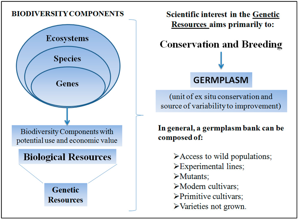 The concept of biodiversity may vary according to the context in which it is employed. Biodiversity may be defined as the totality of genes, species, and ecosystems of a specific region or the planet as a whole. This totality is the result of evolutionary processes [,]. The components of biodiversity with an immediate and/or potential interest for humans constitute a biological resource that may, in turn, be classified as a genetic resource [] including the genetic variability of social and economic assets. In general, genetic resources are considered sources of variability (natural raw material) both for breeding programs and to support conservation strategies. However, several characterizations that involve different methodological approaches are required to use genetic resources for the conservation of biodiversity and genetic breeding. We have devised an illustrative scheme to facilitate the understanding and visualization of the relationships among the presented concepts (Figure 3). However, for readers interested in expanding on this theme, we also recommend the reading of specialized texts [].