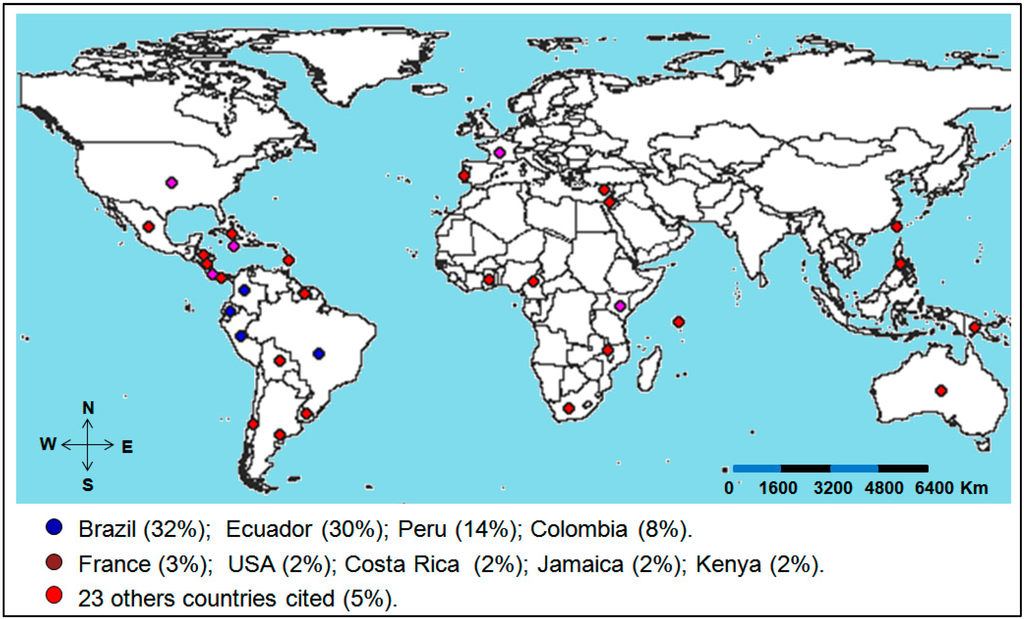 Similar to the lack of information available on the cytogenetics (discussed in the introduction of this review) and genetic diversity of Passiflora, the number of accessions present in collections and active germplasm banks (BAGs) of passion fruit are considered incipient in Brazil and across the world [,,]. At least 1200 accessions of Passiflora spp. are estimated and are preserved in 50 collections of germplasms distributed in approximately 32 countries (Figure 4) [,]. Among these countries, we highlight Brazil, Ecuador, Peru and Colombia, which account for approximately 84% of accessions. Although it is likely that the exact number of accessions kept in these collections has varied since the compilations made by Ferreira [], the predominance of accessions in South American collections present in tropical countries is expected because this region is considered as a center of diversity of the genus Passiflora [,,,]. In addition, these same countries are recognized as leading producers of passion fruit. []. Although Brazil is considered an important center of genus diversity, extant collections contain fewer than 70 species of the genus, or approximately 50% of the Brazilian Passiflora species and less than 15% of all species within the genus []. Furthermore, the majority of accessions in BAGs lack biological, genetic, and molecular characterizations. This dearth of information on accessions is partially responsible for the lack of passion fruit breeding programs and may have also resulted in the reduced productivity of existing programs.
