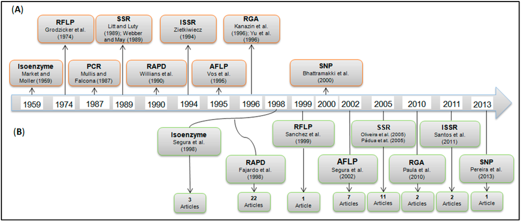 Chronological schematic illustrating the main molecular markers and their initial reference (A) as well as the published articles using molecular markers in the genus Passiflora, their initial reference, and the total number of papers (B).