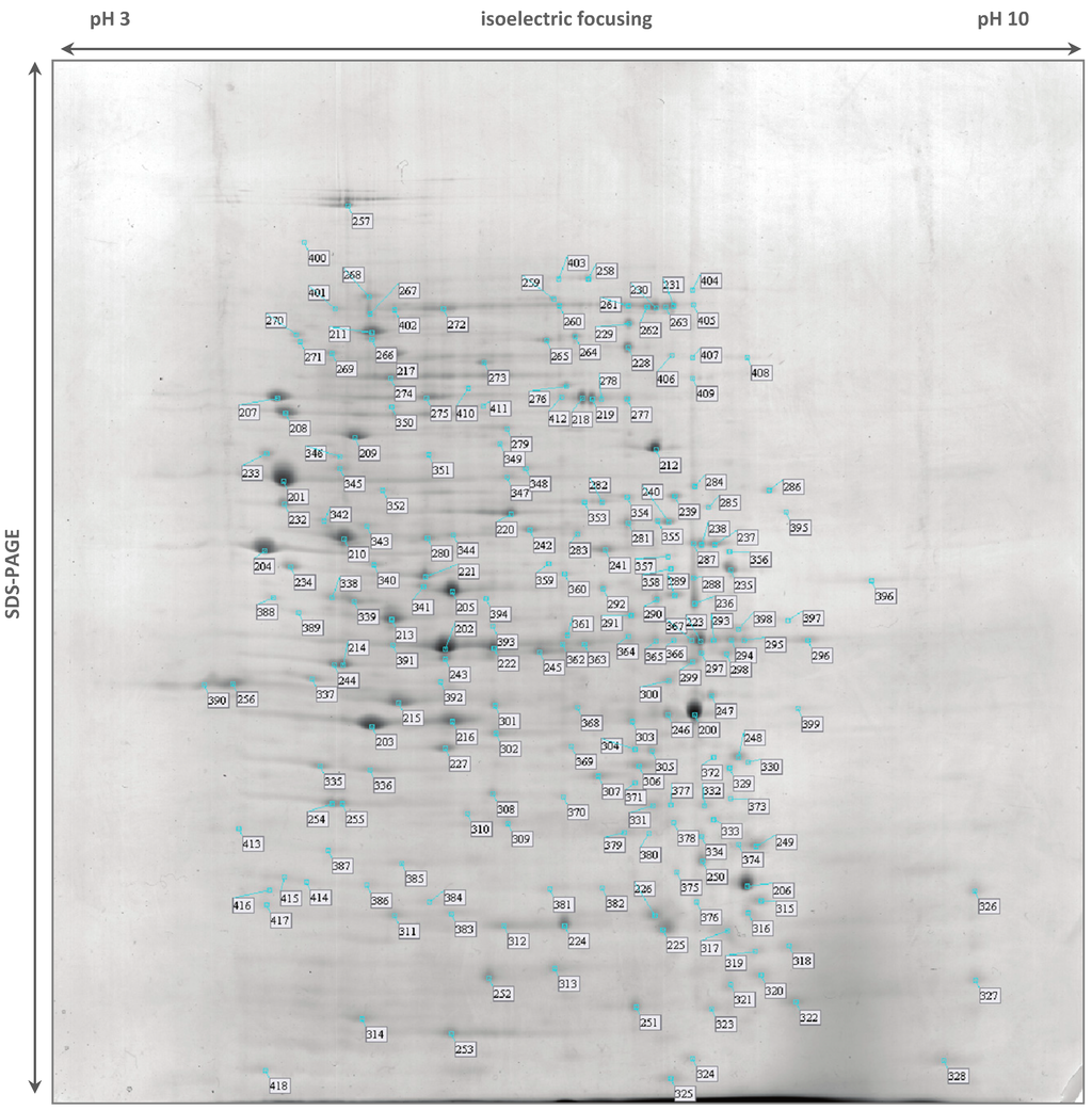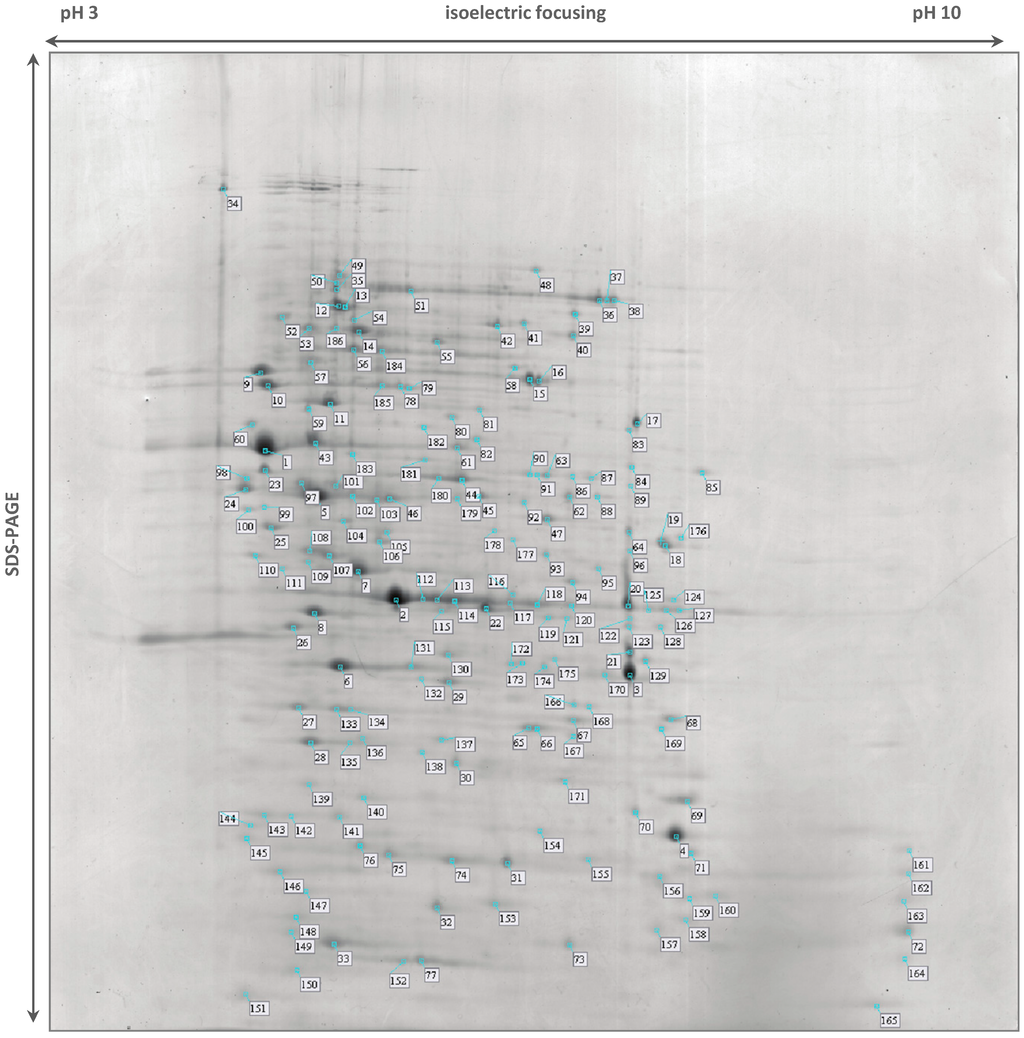 Stained 2-DE (two dimensional gel electrophoresis) gel of total proteins of Salmonella Typhimurium Se20 (phage type DT104B) using IPG (Immobiline™ pH Gradient) strips pH 3–10 NL (non-linear) for the first dimension. Numbered spots were excised for analysis by in-gel digestion and MALDI-TOF MS (matrix-assisted laser desorption/ionization mass spectrometry) identification, described in Table S1.