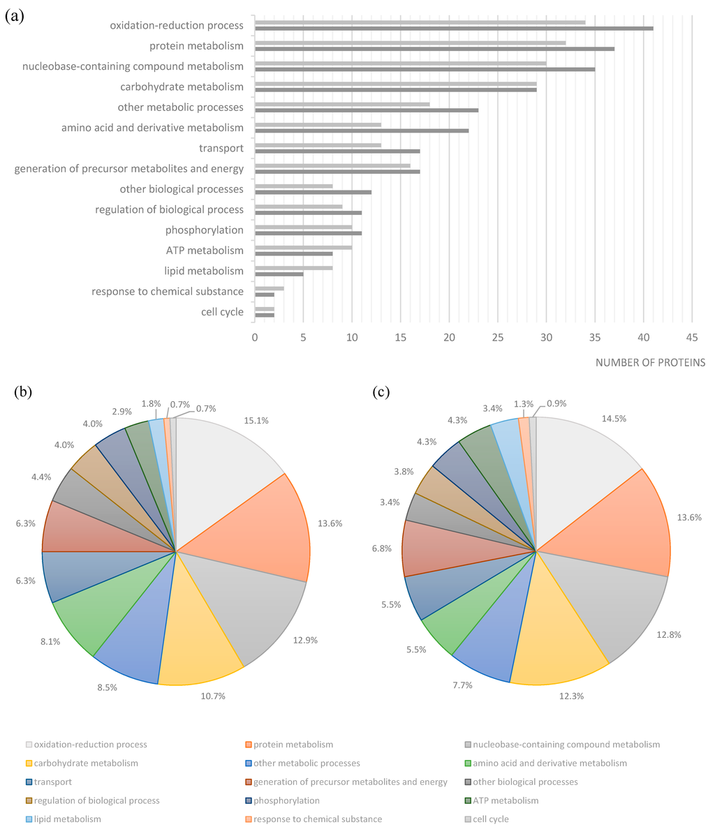 Functional classification of proteins identified in the Se20 and SL1344 strains based on Gene Ontology. (a) Number of proteins in each category for Se20 (light gray) and SL1344 (dark gray); Relative percentages of protein functions in (b) Se20 and (c) SL1344. As this classification reflects the fact that single proteins can be involved in more than one process, the sum of proteins in all categories is higher than the total number of unique proteins identified.