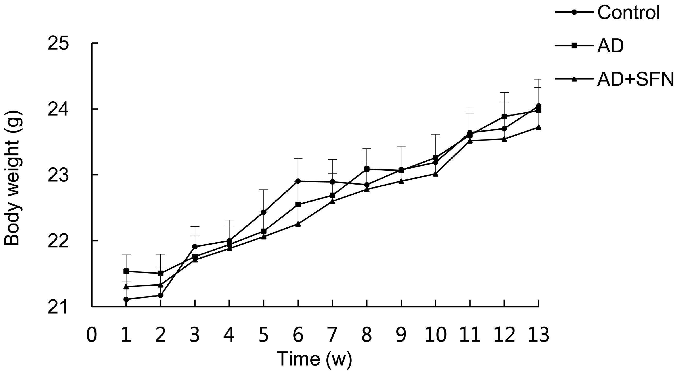 Measurement of mice body weight. During the treatment, no significant difference in bodyweight was observed among control, Alzheimer’s disease-like (AD-like)miceand sulforaphane-treated Alzheimer’s disease-like (AD+SFN-like) mice (n = 18; mean ± S.E.M.; One-way analysis of variance followed by post hoc least significant difference multiple comparison tests).