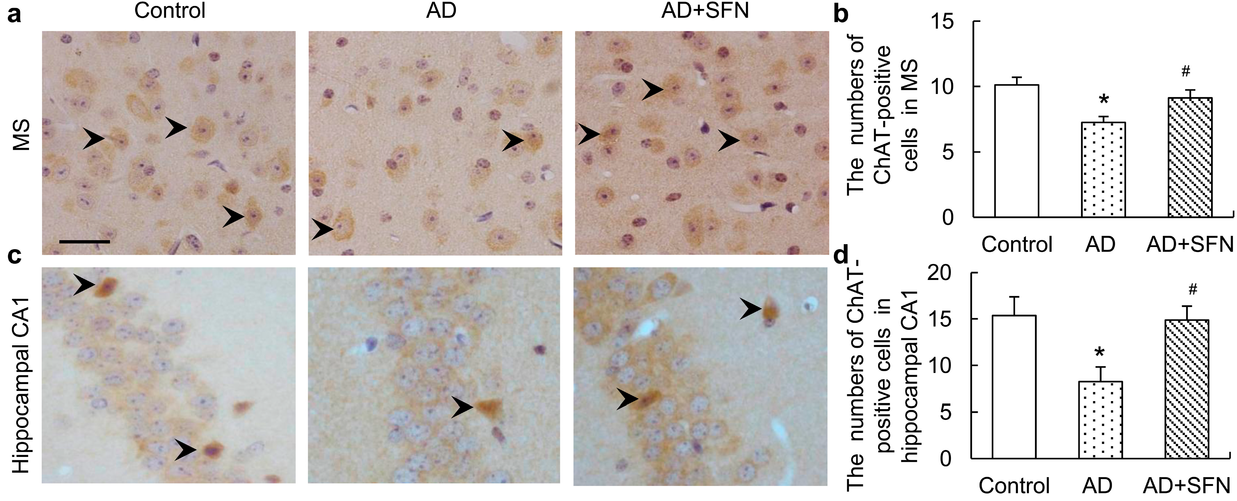 Immunohistochemistry assays of cholinergic neurons in themedial septal (MS) and hippocampal CA1 regions. Brown immunoreactive cells imply the cholinergic neurons in mice brain (see arrows, bars = 50 μm). The numbers of cholinergic neurons were markedly decreased in the MS (a) and hippocampal CA1 (c) regions of AD-like mice compared with controls and AD + SFN-like mice. However, the numbers of cholinergic neurons in these regions did not differ significantly between groups of control and AD-like mice with sulforaphane treatment; (b) and (d) showed quantitative assessments of choline acetyltransferase (ChAT) immuno-positive neurons in MS and hippocampus CA1, respectively. (n = 8; means ± S.E.M.; One-way analysis of variance followed by post hoc least significant difference multiple comparison tests; * p < 0.05 versus control, # p < 0.05 versus AD; magnify 400×; all cholinergic neurons in hippocampus CA1 were counted; number of cholinergic neurons of each field of vision in the MS was counted).