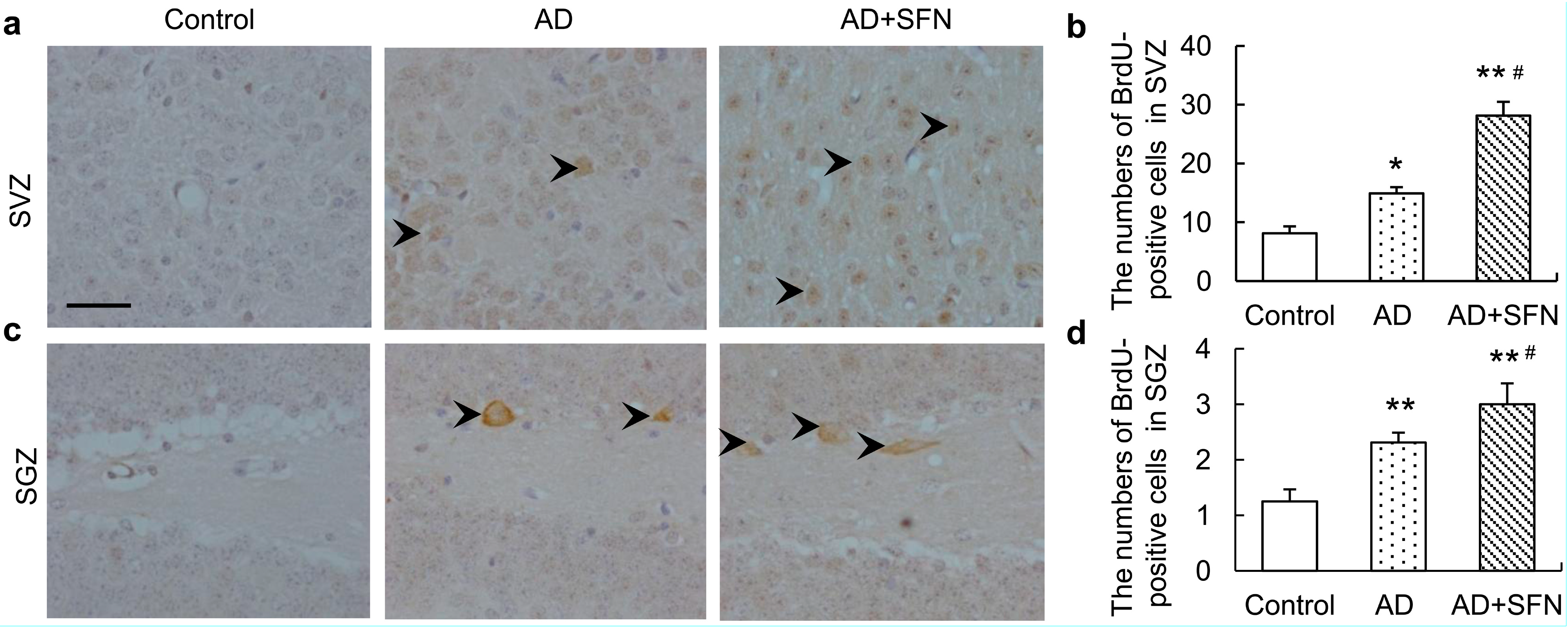 Immunohistochemistry assays of5-bromo-2'-deoxyuridine (BrdU)-positive neurons in thesubventricular zone (SVZ) and subgranular zone (SGZ).Brown immunoreactive cells imply the BrdU-positive neurons in mice brain (see arrows, bars = 100 μm). Compared with controls, significantlymore BrdU-positive cells were observed in the SVZ (a) and SGZ (c) of AD-like mice and AD+SFN-like mice. Moreover, sulforaphane significantly increased the numbers of BrdU-positive cells in the SVZ (a) and SGZ (c) of AD-like mice;(b) and (d) showed quantitative assessments of BrdU-positive cells in SVZ and SGZ, respectively. (n = 8; means ± S.E.M.; One-way analysis of variance followed by post hoc least significant difference multiple comparison tests; * p < 0.05 versus control, # p < 0.05 versus AD; ** p < 0.05 versus control; magnify 200×; numbers of BrdU-positive neurons of each field of vision in both SVZ and SGZ were counted).