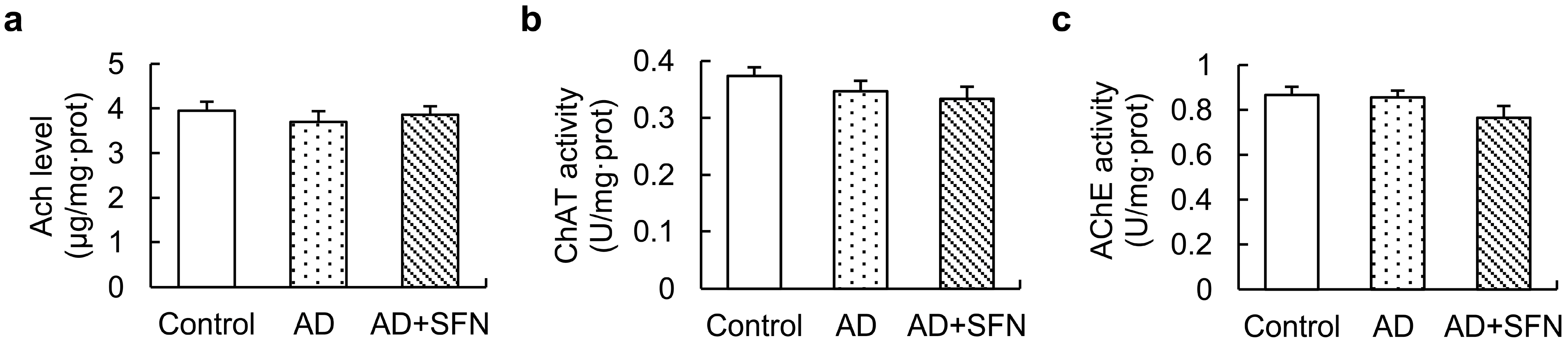 Acetylcholine (Ach)level and activities of ChAT and acetylcholinesterase (AChE) in the cerebral cortex.ACh level (a) and activities of ChAT (b) and AChE (c) in the cerebral cortex did not differ significantly among controls, AD-like mice and AD + SFN-like mice. (n = 10; means ± S.E.M.; One-way analysis of variance followed by post hoc least significant differencemultiple comparison tests).