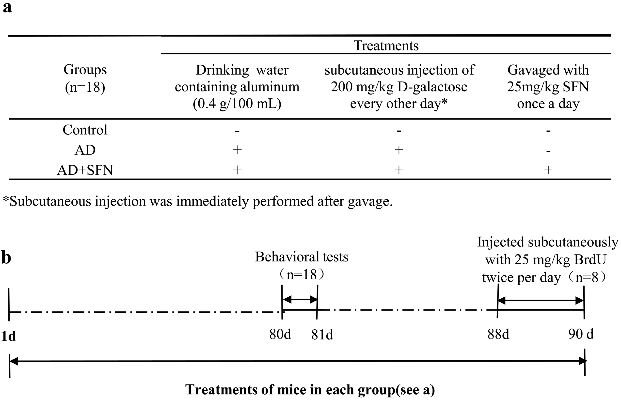 Scheme of animals groups and treatments. As shown in (a), mice were divided into 3 groups: control, AD-like and AD + SFN-like. Mice in groups of AD and AD + SFN were administered by the daily and free provision of drinking water containing aluminum (0.4 g/100 mL) and subcutaneous injection of 200 mg/kg d-galactose (dissolved in physiological saline) every other day. Distilled water and an equivalent amount of physiological saline were administered to mice in the control group as drinking water and by subcutaneous injection, respectively. Mice in the AD + SFN group were gavaged with 25 mg/kg sulforaphane (dissolved in distilled water) once a day, whereas mice in groups of AD and control were gavaged with an equivalent amount of distilled water; (b) shows that all mice were treated for 90 days. Behavioral tests were performed after 80 days of treatment. Three days before sacrifice, 25 mg/kg 5-Bromo-2'-deoxyuridine (BrdU) was subcutaneously injected twice per day to 8 mice in each group.