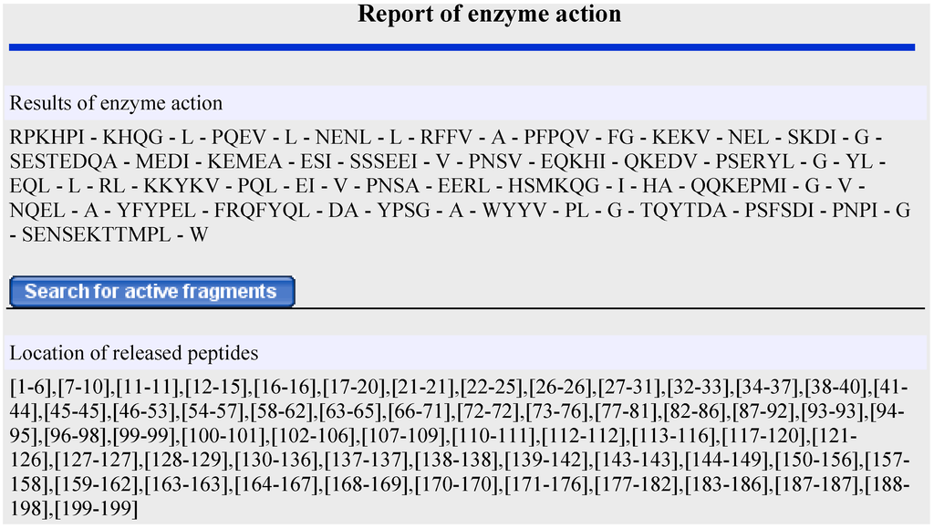 - PeptideCutter. Available online: http://www.expasy.org/tools/peptidecutter/ (accessed on 7 January 2014).