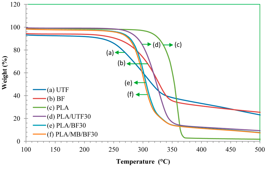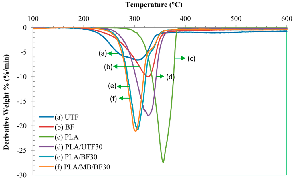 2.9. Thermogravimetric Analysis (TGA) of Biocomposites