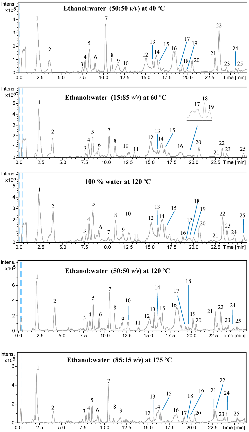 To evaluate the differences among the different extraction conditions, all the filter cake extracts were analyzed by HPLC-DAD-ESI-TOF/MS in order to establish the differences in their phenolic composition. Figure 1 depicts the chromatographic profiles obtained under the extraction conditions described in Table 1. Basically, all of the filter cake extracts show similar profiles, making it possible to identify up to 25 compounds (vide infra). However, some differences can be observed in the peak intensity of several compounds depending on the extraction conditions. For instance, by comparing the chromatogram of the extract obtained at 120 °C using 100% water with the extract obtained using the same temperature (120 °C), but using ethanol:water, 50:50 (v:v), it can be seen that some compounds (e.g., Peak 20) are better extracted using 100% water, while other compounds (e.g., Peaks 7, 16, 21) are better extracted using ethanol:water 50:50. This result shows the good possibilities of PLE in terms of selectivity variation.