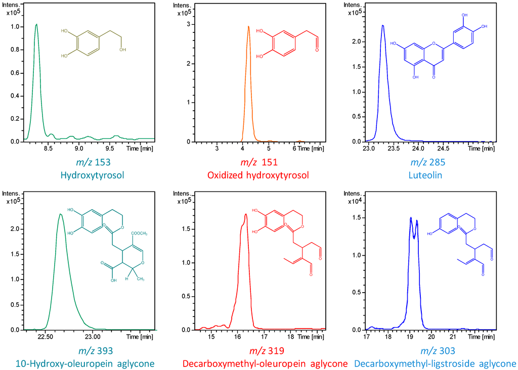 The chemical precursors of these compounds have also been detected in the samples analyzed: oleuropein aglycone (Peak 23) and its hydroxyl and/or decarboxymethyl derivatives (Peaks 14, 15 and 21), as well as ligstroside aglycone decarboxymethyl and hydroxydy-decarboxymethyl derivatives (Peaks 17 and 18). These phenolic compounds have been previously reported as characteristic polyphenols in EVOO [22,23,24,25]. Finally, the molecular ions at 285.0420 m/z and 269.0480 m/z were assigned to flavones, namely luteolin (Peak 22) and apigenin (Peak 25). Some structures along with the extracted ion chromatogram of the main polyphenols compounds identified in the filter cake extract are shown in Figure 2.