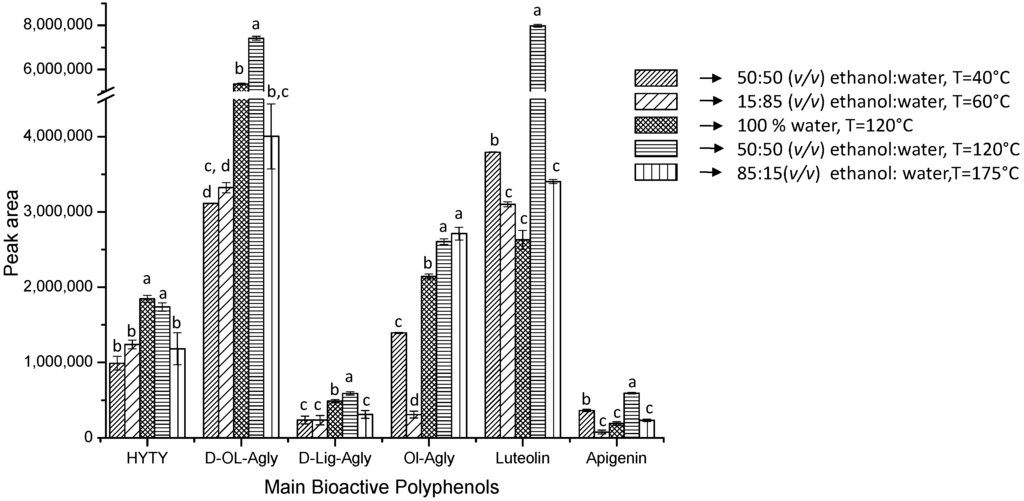 Peak area of the main bioactive phenolic compounds characterized in filter cake (HYTY, hydroxytyrosol; D-OL-Agly, decarboxymethyl-oleuropein aglycone; D-Lig-Agly, decarboxymethyl-ligstroside aglycone; Ol-Agly, oleuropein aglycone; luteolin and apigenin) under different PLE conditions. Values with the same letter (a, b, c or d) show that there is no statistically significant difference between the area of these compounds at the 95% confidence level (p ≤ 0.05).