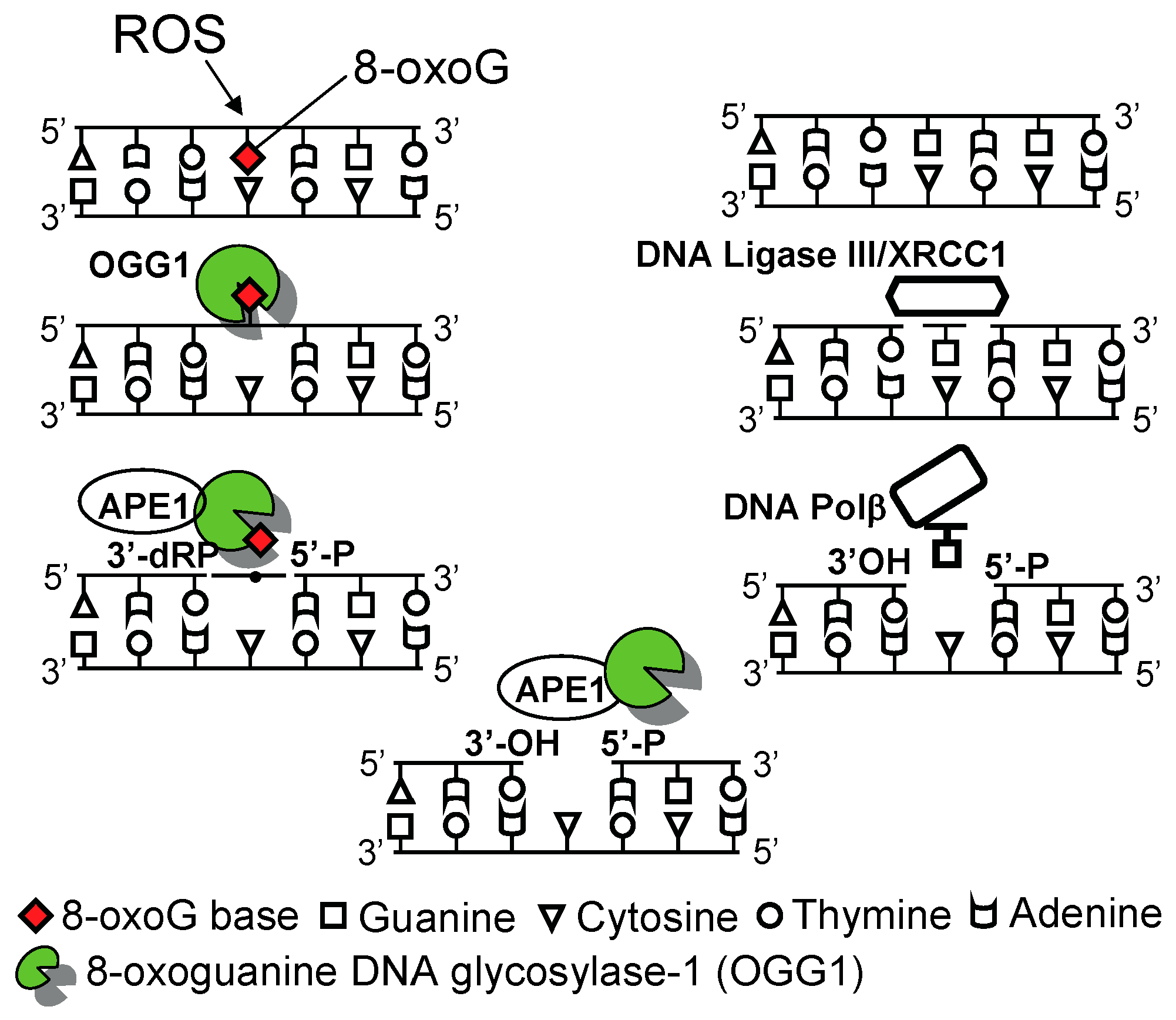 After 8-oxoG base removal, OGG1, via its AP-lyase activity, cleaves the DNA phosphate backbone at the abasic site by formation of 3'-phospho-α,β-unsaturated aldehyde (3'dRP) and 5'-phosphate termini (called apurinic/apyrimidinic (AP)-site). The 3'-dRP terminus produced by the β-elimination reaction cannot serve as a primer for repair synthesis by DNA polymerases, so it must be removed by a 3'-phosphodiesterase activity of the apurinic/apyrimidinic endonuclease 1 (APE1), generating a 1-nucleotide gap [17,20,22]. DNA polymerases, primarily the DNA polymerase β, then incorporate guanine at the gapped site, and the resulting nicks are subsequently sealed by a DNA ligase to complete the repair process (Figure 1).