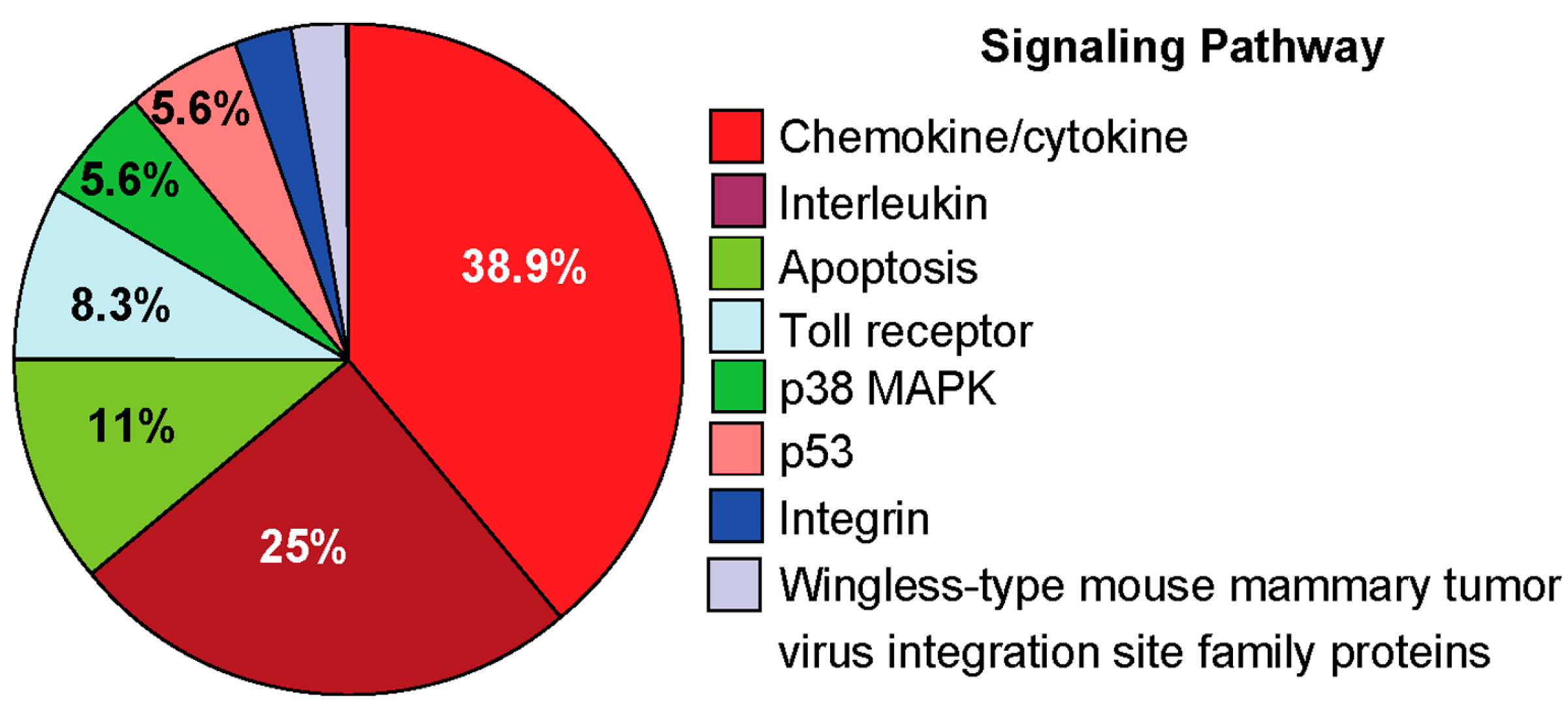 Signaling pathways induced by exposing the lungs to 8-oxoG base. Analysis by PANTHER software included genes that were upregulated in Cluster A and B (Figure 4). The percentages of genes for each category were calculated as described previously [108].