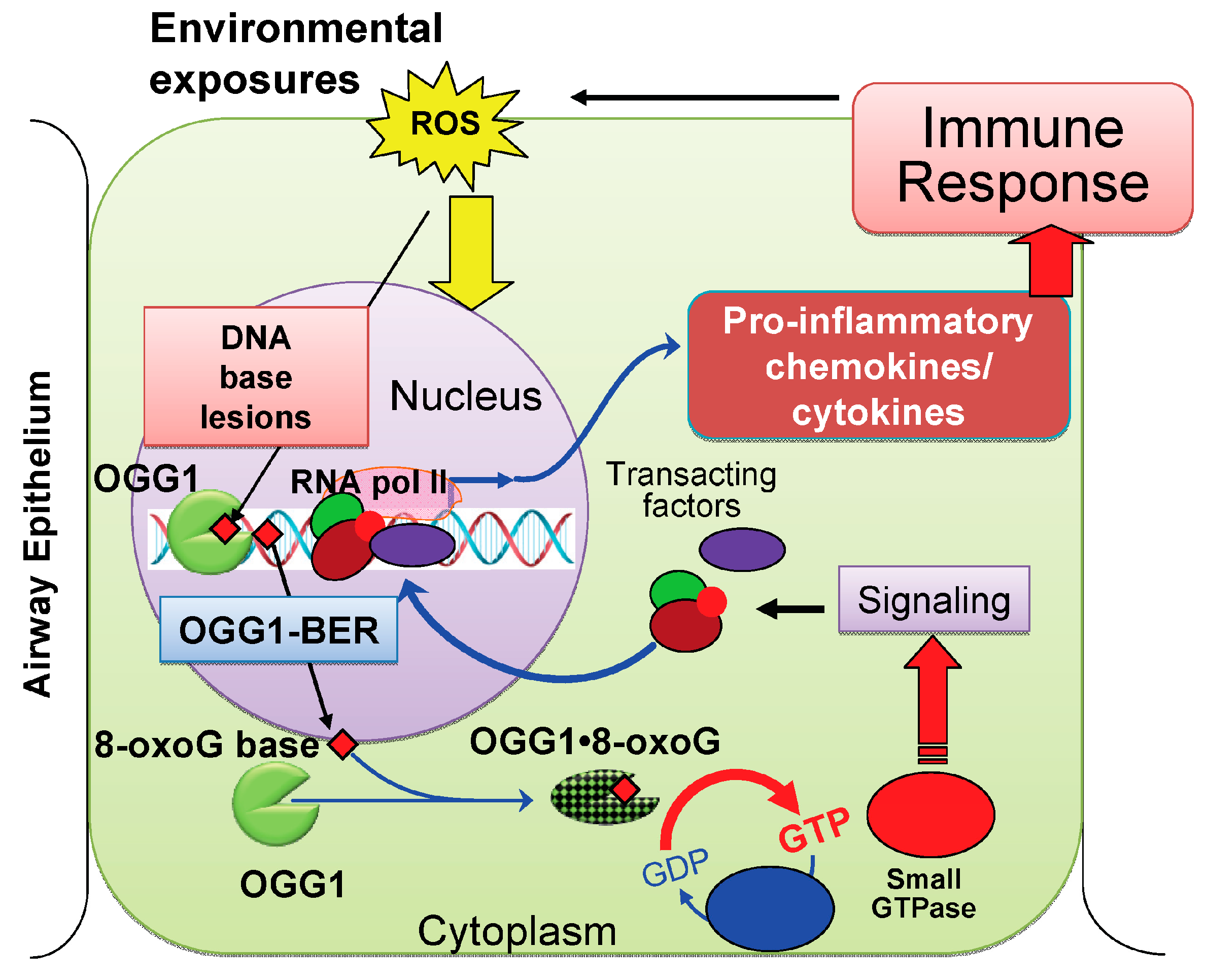 A proposed model for lung inflammation by repair of oxidatively damaged DNA via OGG1–BER. When environmental exposures occur or during an inflammatory process, Reactive oxygen species (ROS) are generated by cellular oxido-reductases and mitochondrial dysfunction in the airway epithelium. Due to guanine’s lowest oxidation potential, the most frequent base damage in DNA is 8-oxoG, which needs to be repaired to prevent mutations. 8-OxoG base is released by OGG1–BER (Figure 1) and transported to the cytoplasm, where it is bound by OGG1, and the resulting complex (OGG1·8-oxoG) functions as a guanine nucleotide exchange factor and mediates GDP→GTP exchange. Activated small GTPase(s) signal expression of pro-inflammatory genes, which induce an innate immune response. Recruited inflammatory cells induced ROS, DNA damage and repair that may lead to a vicious cycle of OGG1·8-oxoG→RAS–GTP→inflammatory signaling, maintaining chronic inflammation.