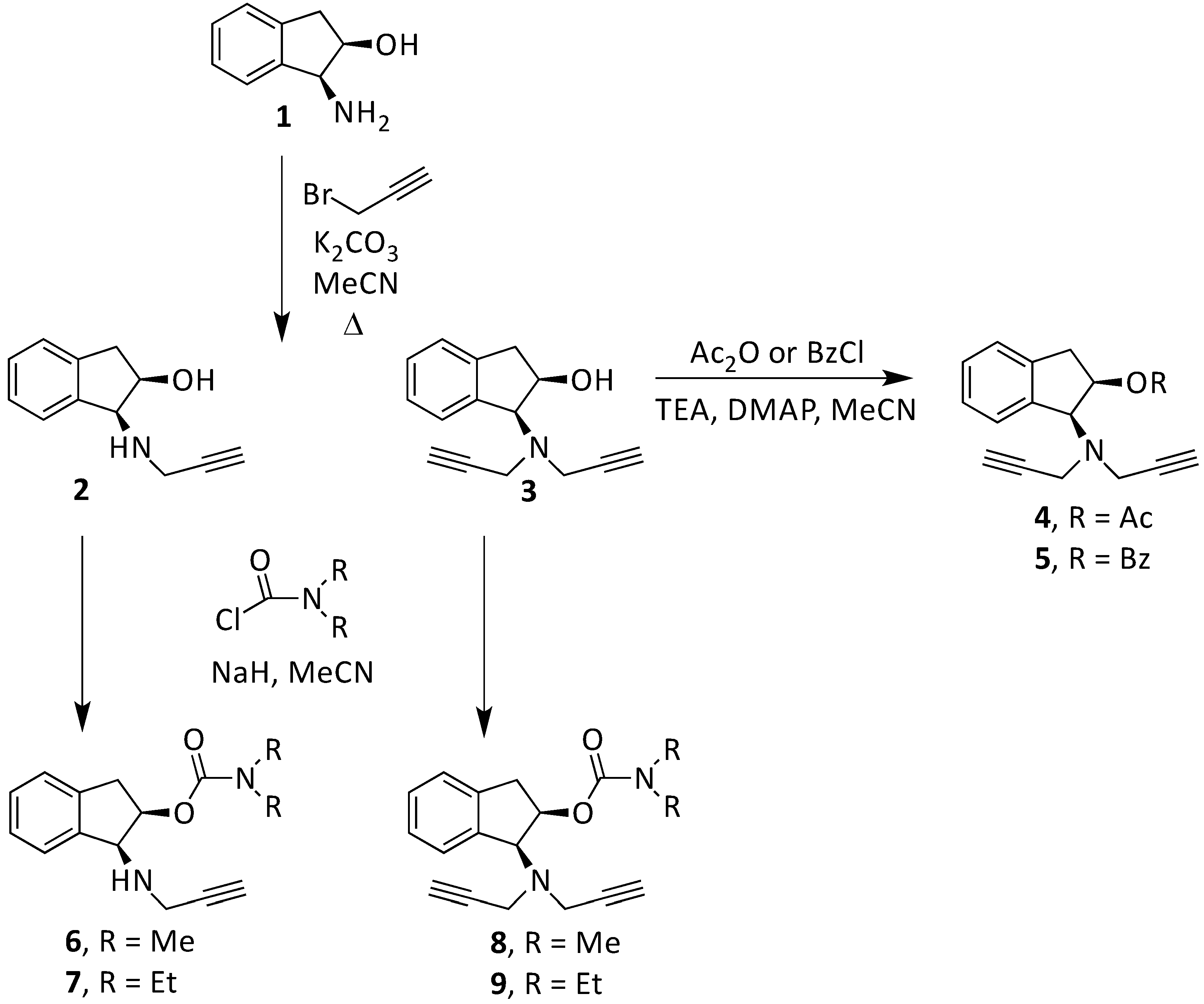 Compound (8): (1S,2R)-(−)-cis-1-(N,N-Dipropargylamino)-2-indanyl dimethylcarbamate. Was obtained as a white solid (76 mg, yield 58%). M.p. 109–112 °C.