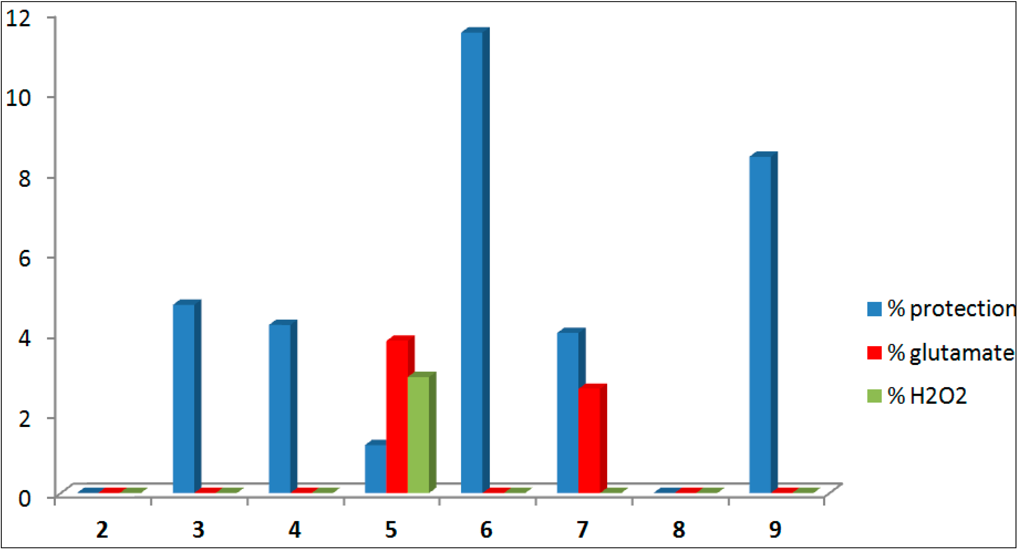 We used the MTT reduction assay following the procedure previously described [65]. After the appropriate incubations with the compounds alone, or co-incubated with 100 µM H2O2 or glutamate, 0.5 mg/mL MTT were added to each well and incubation was performed at 37 °C for 2 h. Formazan salt formed was dissolved in DMSO, and colorimetric determination were performed at 540 nm. Control cells without compounds or toxic stimulus were considered 100% viability. Neuronal viability after exposure to compounds or different treatments was expressed as% of control within each individual experiment. Graph Pad Prism Software (GraphPad Software, San Diego, CA, USA) was used to perform statistical analyses and graphical presentation. Experiments were reproduced at least three times. Data were expressed as mean ± S.E.M. values. Groups were compared by ANOVA/Dunnett’s test. A p-value ≤0.05 was accepted as the limit of statistical significance.