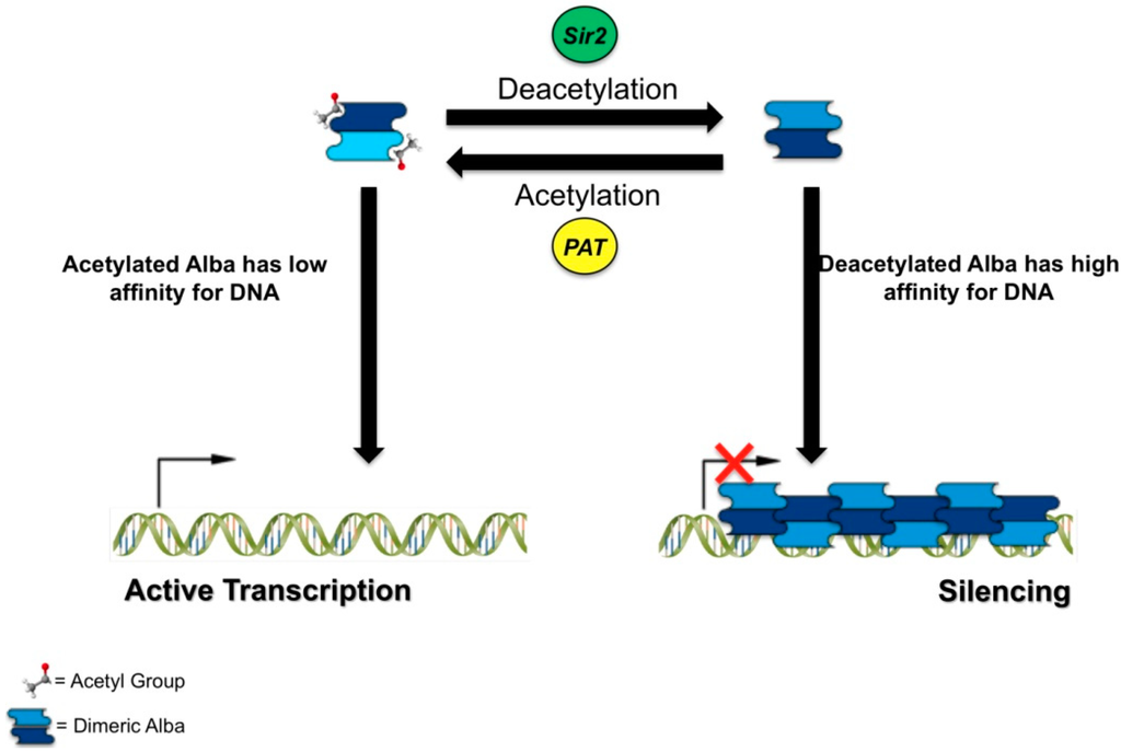 Diagram showing a model for the post-translational regulation of Alba and its effect on trancription.
