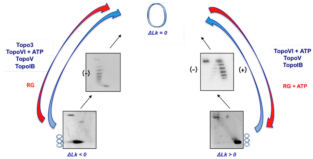 Activities of DNA topoisomerases of hyperthermophilic archaea on circular plasmids. The gels show typical migration of plasmid topological isomers: ΔLk (Linking number) < 0 (negatively supercoiled); ΔLk = 0 (relaxed); ΔLk > 0 (positively supercoiled). Red arrows indicate the direction of activity of reverse gyrase (RG), which is always directed toward increasing linking number (from negative, to relaxed, to positive topoisomers). Blue arrows indicate the activity of all other topoisomerases, e.g., relaxation of either negative or positive topoisomers, with the exception of Topo3, which only relaxes negative supercoiling.