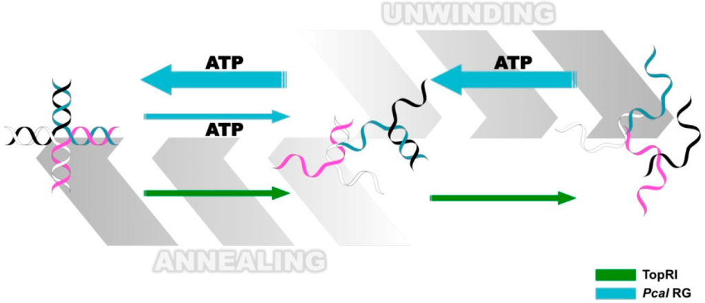 Diagram comparing the activities of the S. solfataricus TopR1 and P. calidifontis PcalRG reverse gyrases on synthetic Holliday junctions. Light blue arrows indicate PcalRG activities (ATP-dependent unwinding and ATP-indepedent annealing); green arrows indicate TopR1 ATP-independent unwinding; the four DNA strands are shown in white, pink, black and blue, respectively. Whereas TopR1 unwinding activity proceeds up to single strand oligonucleotides, the main products of PcalRG unwinding are Y-shaped forks, likely because single strand products are annealed back [104,113].