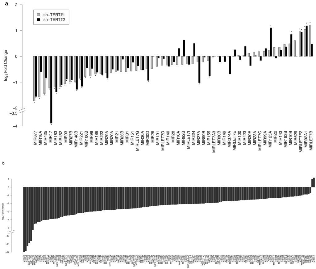 Mature miRNAs are regulated by TERT. Fold changes in miRNA expression measured by sequencing in HeLa cells (a) and THP-1 cells (b). Bars highlighted with asterisks represent statistically-significant changes. In HeLa cells, the changes were measured using sh-TERT#1 (gray) and sh-TERT#2 (black). In THP-1 cells, the changes were measured using a siRNA targeting TERT.