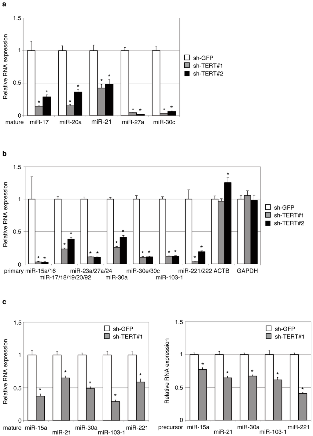 Mature miRNAs and their precursors are downregulated upon TERT suppression. The expression levels of primary, precursor and mature miRNAs in HeLa cells were analyzed with RT-qPCR under the suppression of TERT by sh-TERT#1 (gray) or sh-TERT#2 (black). The relative amount of the individual miRNAs was normalized to U6, and the mean expression levels of normalized sh-GFP (white) refer to one. (a,b) RT-qPCR of mature (a) and primary (b) miRNAs performed with total RNAs. The mRNA levels of ACTB and GAPDH were also examined with the same total RNAs; (c) RNAs smaller than 200 nt were used for RT-qPCR of mature (left) and precursor (right) miRNAs. Values represent the means ± SD for three independent experiments. Asterisks represent p < 0.05 compared with sh-GFP.