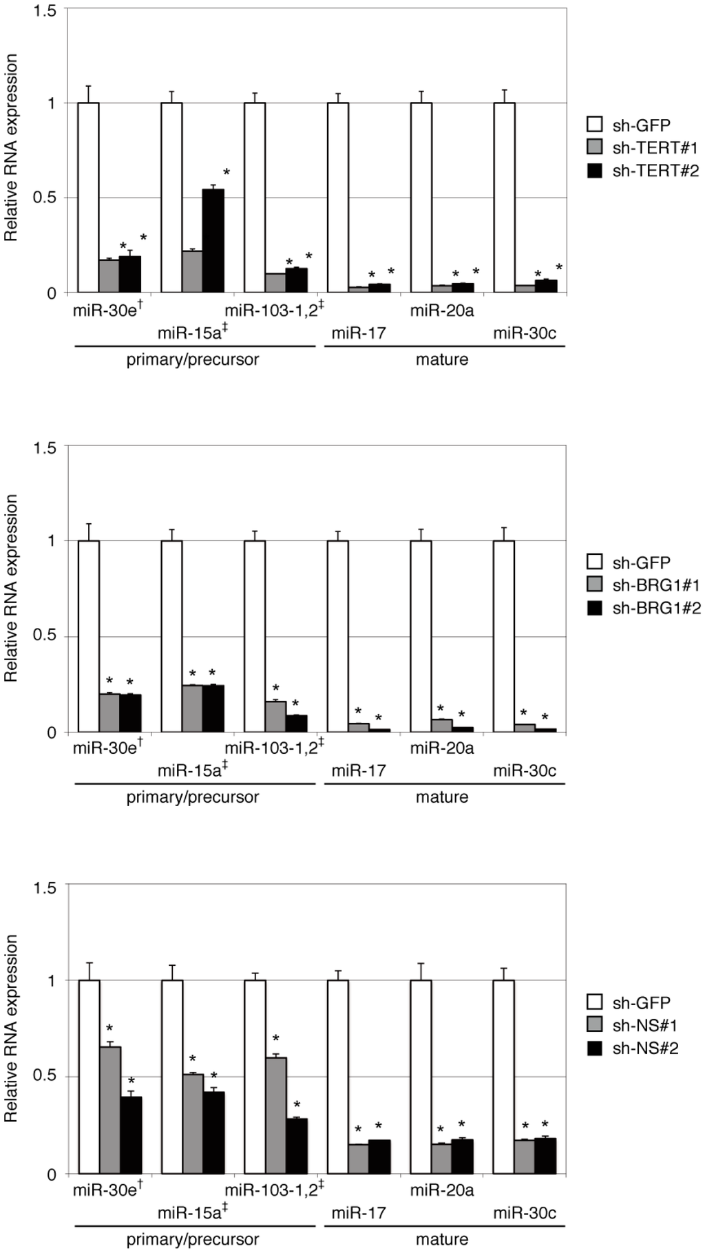 Recently, we and others have found that TERT interacts with BRG1 and NS and forms the complexes that regulate gene transcription and stem cell functions in both normal and malignant cells [21,25]. We have also found that the TERT/BRG1/NS (TBN) complex exerts an RdRP activity, and it is involved in heterochromatin maintenance [20]. To investigate whether the TBN complex contributes to the miRNA regulation, we conducted RT-qPCR of mature miRNAs and the precursors under the suppression of TERT, BRG1 or NS with gene-specific shRNAs [20,21]. The expression levels of mature miRNAs were reduced to comparable levels when knocking down TERT, BRG1 or NS (Figure 3). The primary and precursor miRNAs were also reduced by either BRG1 or NS suppression, just as seen under TERT suppression. These results support the hypothesis that TERT regulates miRNA transcription together with BRG1 and NS.