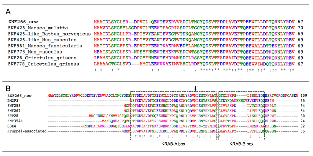 - Grondin, B.; Bazinet, M.; Aubry, M. The KRAB zinc finger gene ZNF74 encodes an RNA-binding protein tightly associated with the nuclear matrix. J. Biol. Chem. 1996, 271, 15458–15467. [Google Scholar] [CrossRef] [PubMed]