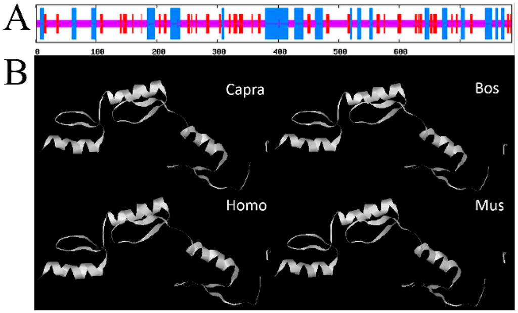 We also investigated the secondary structure and compared the tertiary structure of SP1 protein of capra hircus, bovine, human, and mouse. The protein of SP1 contains 3 alpha helices-rich regions (Figure 1A). The spatial structure of SP1 protein shares a high similarity among different species (Figure 1B).