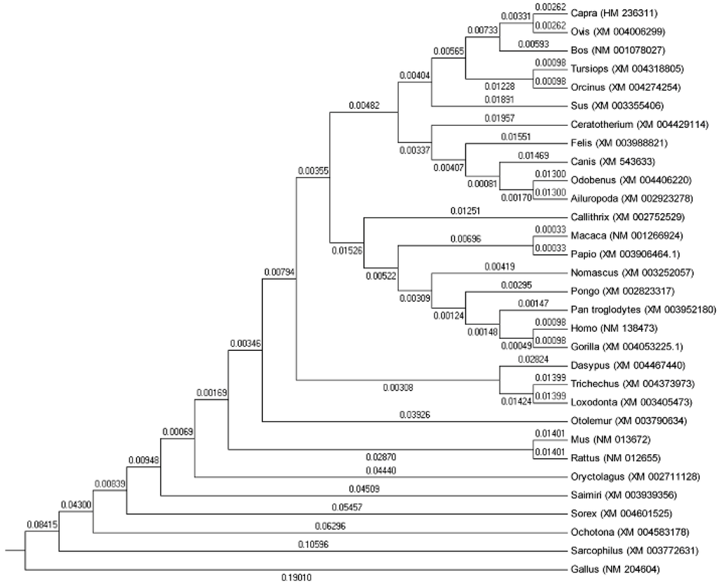To investigate potential evolutionary processes of the SP1 gene among various species, a neighbor-joining phylogenetic tree was constructed, based on sequences of 31 representative animals. The result shows that goat SP1 has the closest relationship with sheep, followed by bovines (including bos taurus, odobenus and cerato therium), pig, primates (pongo, gorilla, macaca and papio) and murine (rattus and mus). Canis and otolemur show the greatest distance from capra hircus (Figure 2).