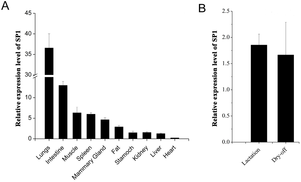 The mRNA expression profiles of SP1. (A) mRNA expression of SP1 in various tissues in dairy goats; (B) Expression level of SP1 between lactation and dry-off periods.