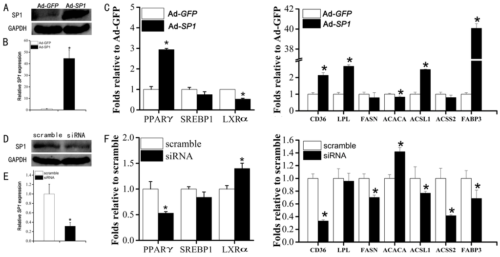 After treatment with adenovirus of Ad-SP1 for 72 h, both the protein (Figure 4A) and mRNA expression (Figure 4B) of SP1 were significantly increased. Accompanying the overexpression of the SP1 gene, an obvious increase was observed in PPARγ expression, while LXRα was decreased dramatically by adenovirus treatment (Figure 4C). Corresponding to the result of SP1 overexpression, silencing of SP1 (Figure 4D,E) decreased the expression of PPARγ and increased the expression of LXRα significantly (Figure 4F). However, SREBP1 remained unaffected after adenovirus or siRNA treatments, though a slight decrease was observed (Figure 4C,F).
