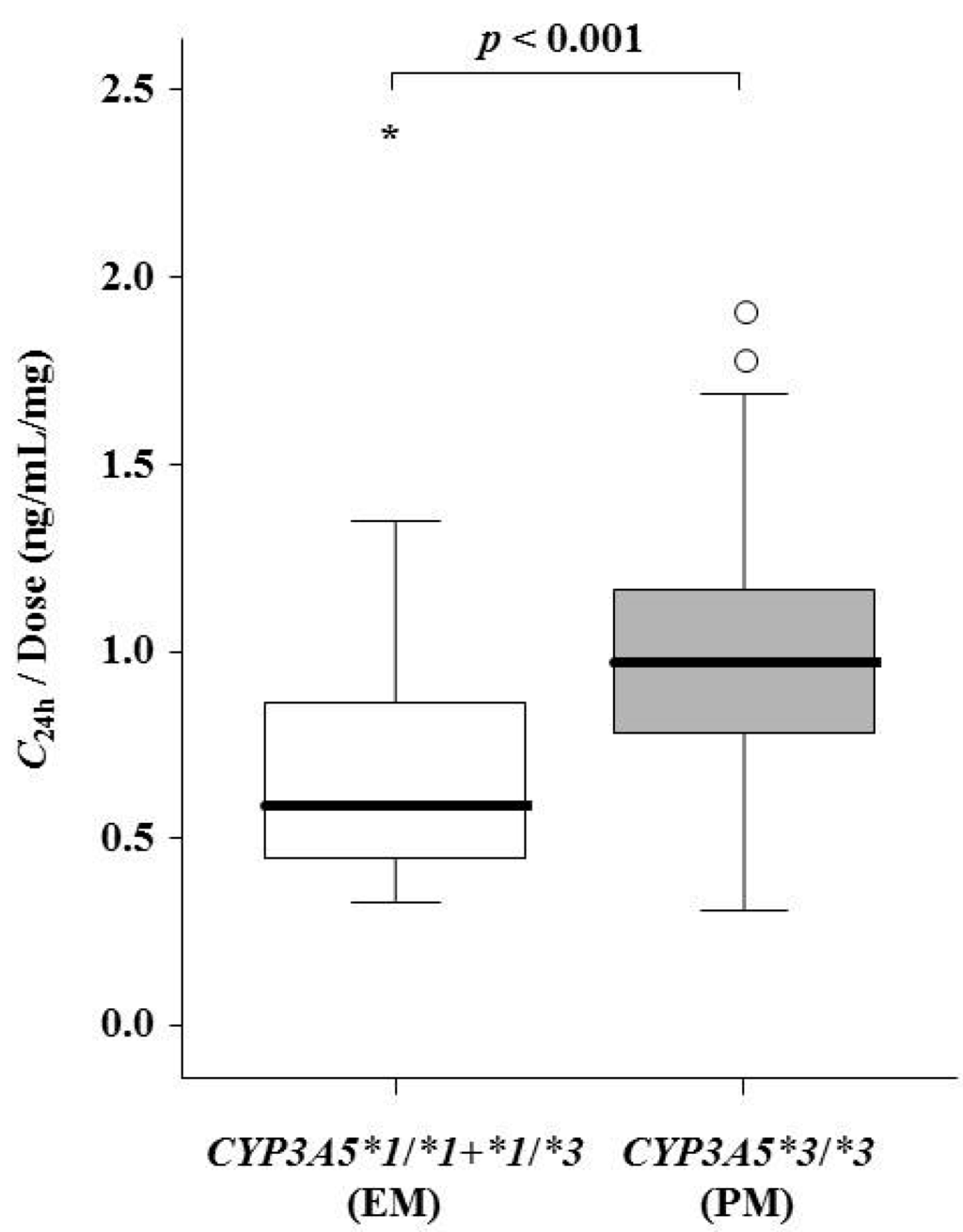 Comparison of dose-adjusted trough concentrations (C24h/dose) just prior to the second dose of tacrolimus pre-transplantation between CYP3A5 extensive metabolizer (EM) (white boxes) and poor metabolizer (PM) (gray boxes) patients. Graphical analysis was performed using an SPSS box and whiskers plot. The box spans data between two quartiles (IQR), with the median represented as a bold horizontal line. The ends of the whiskers (vertical lines) represent the smallest and largest values that were not outliers. Outliers (circles) are values between 1.5 and 3 IQRs from the end of the box. Values of more than three IQRs from the end of the box are defined as extreme (asterisk).