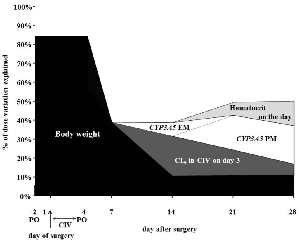 The percentage of tacrolimus dose variation at weekly time points is shown in Figure 2. The contribution ratio of patient body weight for tacrolimus dosage gradually decreased over the initial two weeks and became constant thereafter: 85.0% on grafting operation day; 38.9% on Day 7 after transplantation; 10.3% on Day 14; 10.7% on Day 21; and 10.9% on Day 28. In contrast, the contribution ratio of genetic factors (CYP3A5*1 or *3) and hematocrit on each day for the tacrolimus daily dose increased from Day 14 to 28 after oral administration: 7.2% and 0% on Day 14; 18.4% and 6.9% on Day 21; and 20.4% and 13.1% on Day 28, respectively. On the other hand, the contribution ratio of CLt of tacrolimus during CIV the first three days after surgery was maximum on Day 14 after surgery and gradually decreased thereafter.