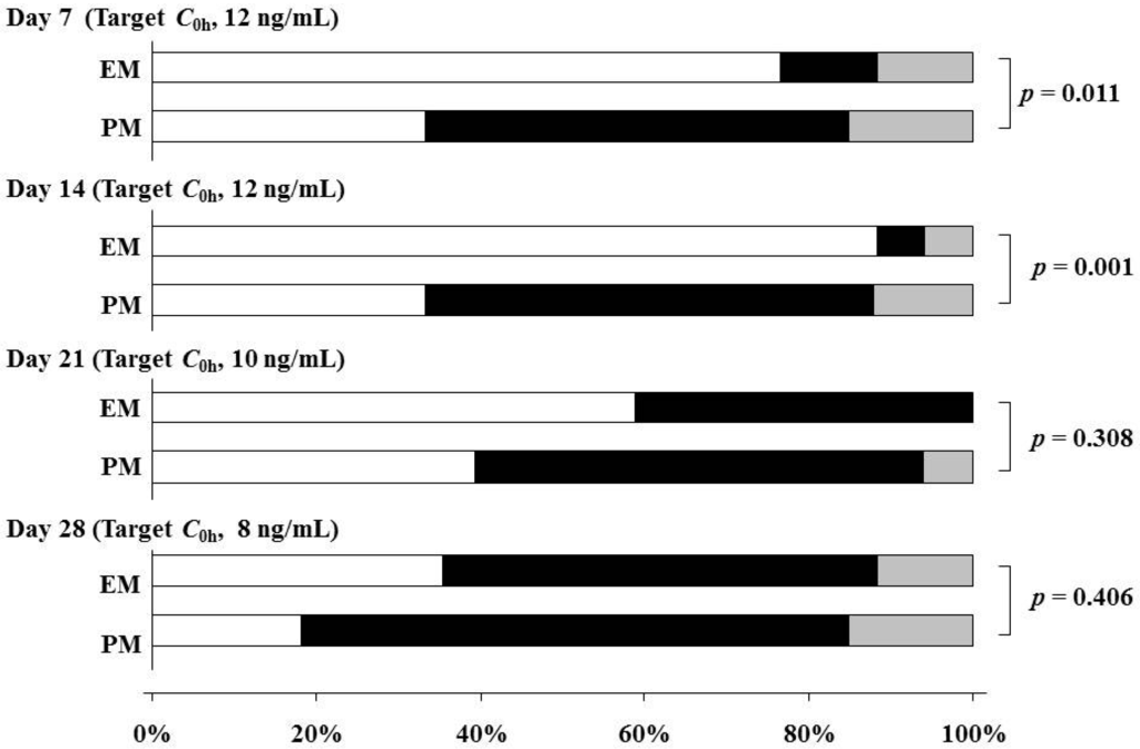Comparison of achievement rates from the initial C0h to the target range (target C0h ± 20%) between CYP3A5 genotypes at each stage after renal transplantation. White columns, lower than the target range; black columns, within the target range; gray columns; more than the target range. EM (*1/*1 + *1/*3), n = 17; PM (*3/*3), n = 33.